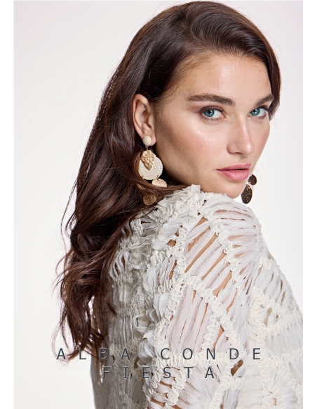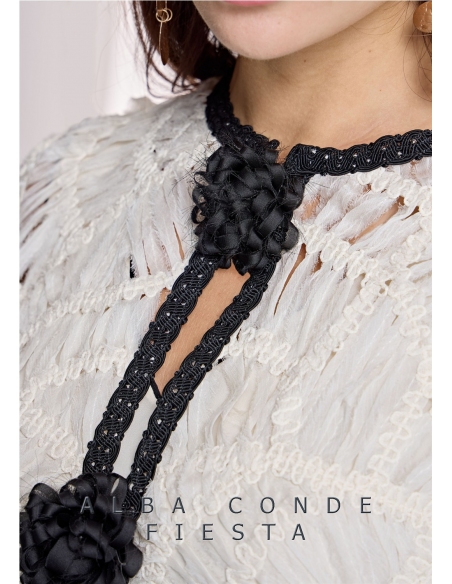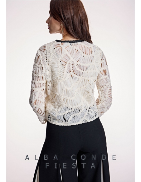 Chaqueta fantasía detalle acabado pasamanería a contraste en escote y canto delantero. Este delicado modelo presenta escote redondo, manga de tres cuartos y cierre central con delicadas flores satán con enganche de corchete interior. Colección Alba Conde INVITADAS. Diseño confeccionado en gasa fantasía tono crudo