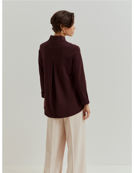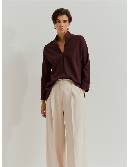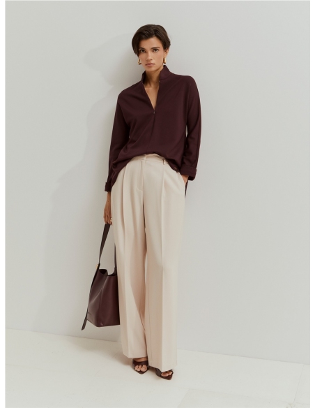 Suéter holgado con cuello medio y cremallera invisible en el escote. Detalle masculino en la espalda para un ajuste más elegante y cómodo. Mangas largas con puños doblados.