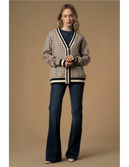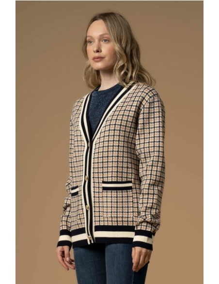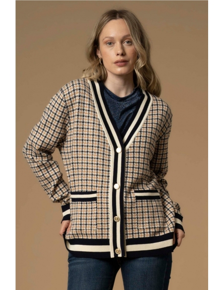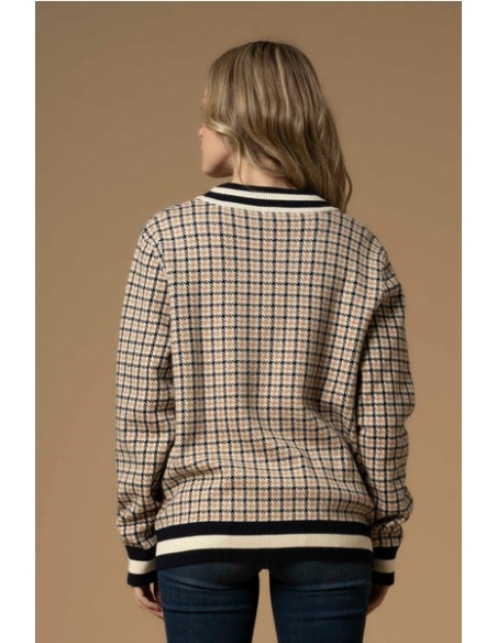 Este suéter de pata de gallo presenta una abertura frontal con botones dorados, perfiles de colores contrastantes y prácticos bolsillos frontales.
