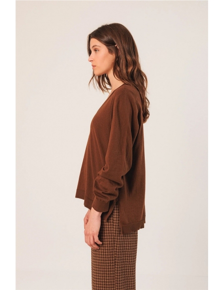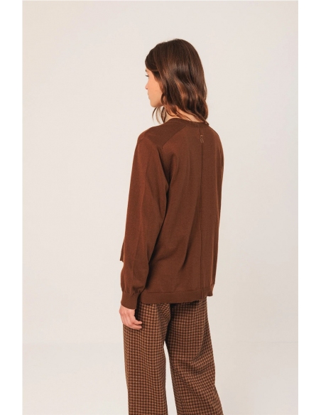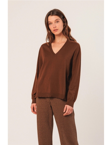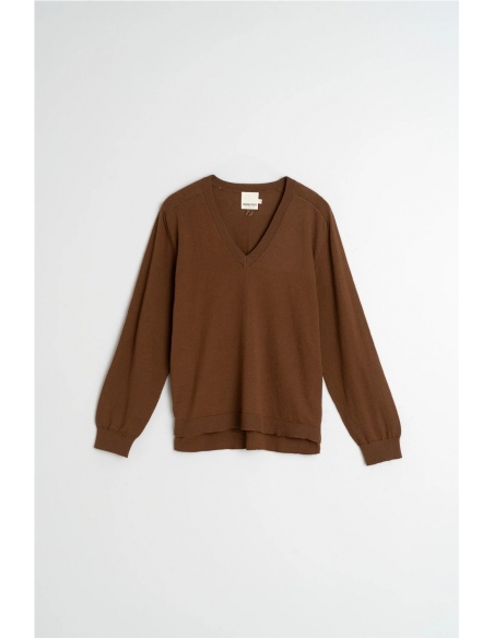 Jersey básico fino de algodón orgánico, con escote pico y manga larga. Detalle de anagrama bordado a tono.