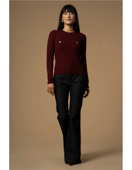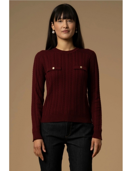 Un delicado punto trenzado embellece la tela de este suéter corto, con cuello redondo, bolsillos con botones falsos en la parte delantera y bordes acanalados. La prenda tiene un corte ligeramente entallado.