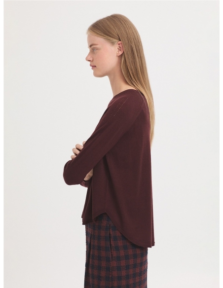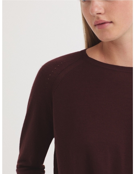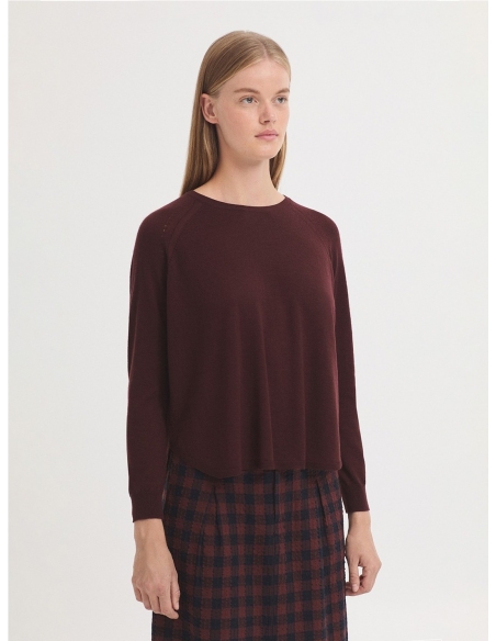 Jersey básico oversize tipo capa en mezcla de lana merino-cachemira. Cuello redondo, manga raglán y acabado en rib.