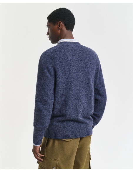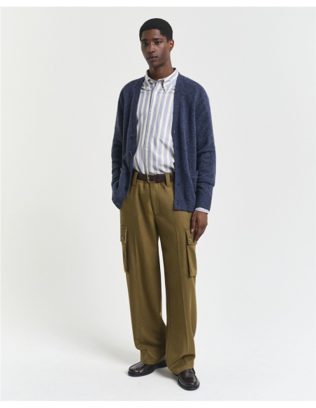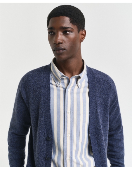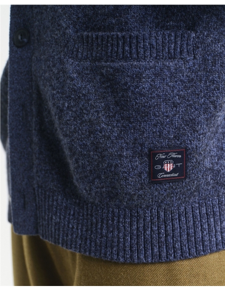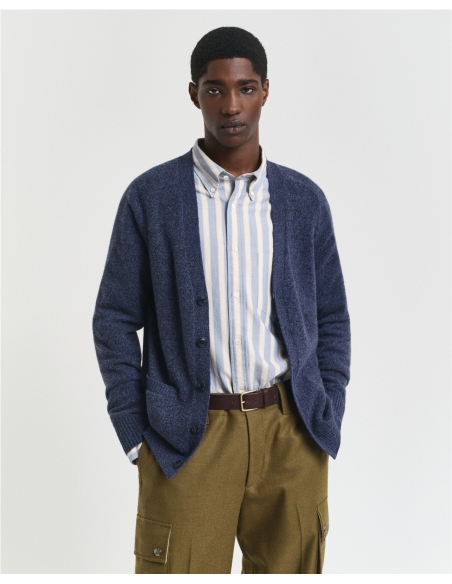 Este cárdigan está confeccionado en una suave mezcla de algodón y lana. Utiliza hilos mouliné bicolor, lo que le da un sutil acabado retorcido. De corte regular, presenta cuello en V, botones en la parte delantera, bolsillos de ribete, hombros de silla de montar y terminaciones de canalé en el bajo y los puños. El cárdigan se completa con una etiqueta de la marca en el bajo.