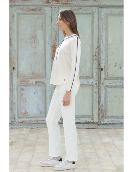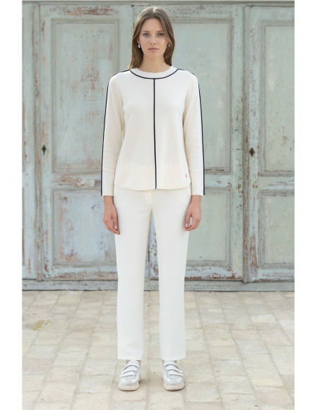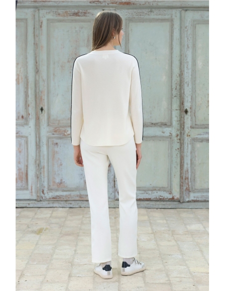 Jersey de punto en tono crudo con un diseño minimalista realzado por pespuntes negros que recorren el escote, el delantero y las mangas, aportando un contraste elegante y actual. Con corte recto y pequeñas aberturas laterales, resulta cómodo y versátil, ideal para dar un aire sofisticado tanto a looks de oficina como a estilismos más informales.