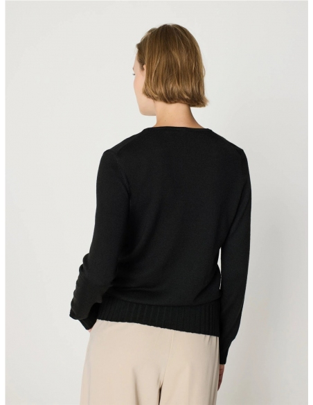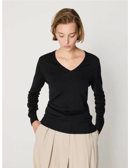 Jersey de lana fina con cuello pico. Ligero, suave y perfecto, con un detalle único en el canalé, para el día a día. Combina estilo y comodidad en una prenda que no puede faltar en tu armario.