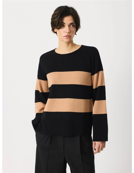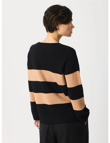 Jersey de corte recto con un estilo clásico de franjas horizontales que combina colores con un acento llamativo de acabado liso y cómodo. La parte superior está dominada por el color negro, mientras que las franjas en beige y negro alternan en la sección