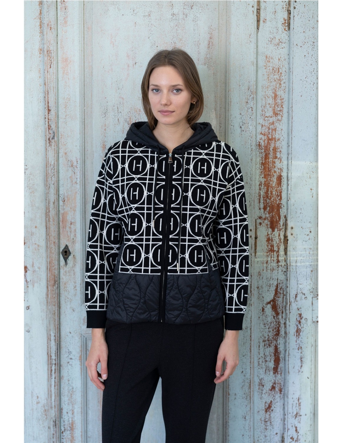 Chaqueta de mujer con capucha ajustable y cierre frontal de cremallera, confeccionada en un tejido suave con estampado integral de monograma geométrico “H”. Disponible en color beige claro o en negro, dos opciones versátiles y actuales para completar cualquier look. Incluye bolsillos delanteros funcionales y detalles acolchados en capucha y bajo que aportan calidez y un aire moderno. Los puños acanalados ofrecen mayor comodidad y ajuste.