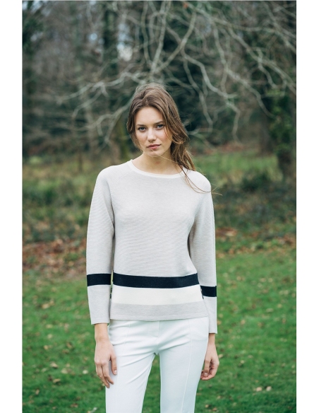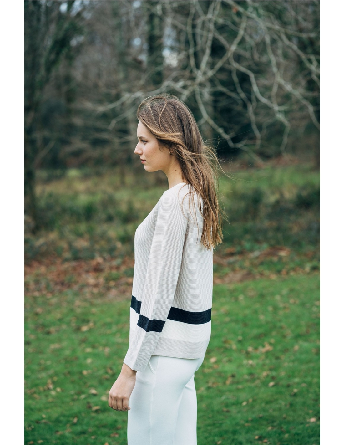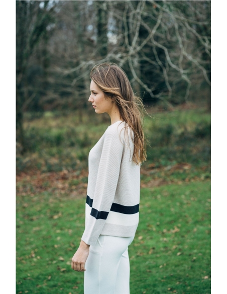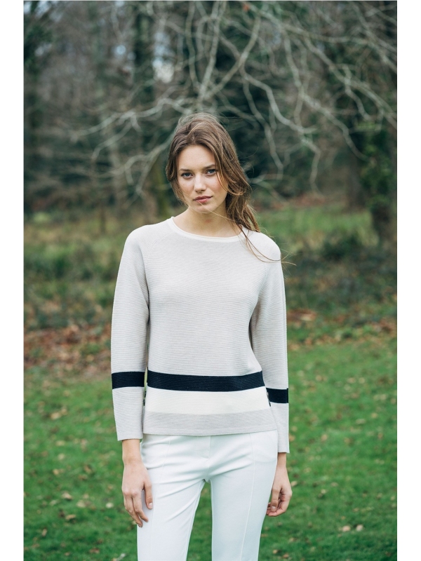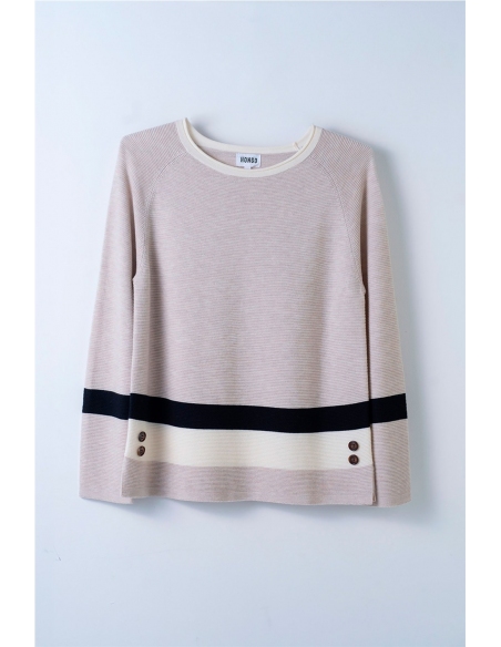 Jersey de punto fino en color beige, con cuello redondo rematado en contraste claro. Incorpora franjas horizontales en negro y crudo en el bajo y las mangas, junto con un detalle de botones laterales que le añaden un toque actual y diferenciador. De corte recto y cómodo, es una prenda versátil que se adapta tanto a estilismos casual como a looks más elegantes.