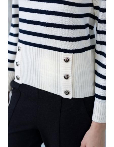 Jersey de punto fino en color marfil con rayas marino de inspiración marinera. El diseño combina un favorecedor cuello redondo y un amplio canalé en la parte inferior que aporta estructura. Como detalle diferencial, incorpora botones metálicos decorativos en los laterales, realzando su estilo elegante y atemporal. Una prenda versátil, perfecta para looks casuales y de oficina con un aire chic francés.