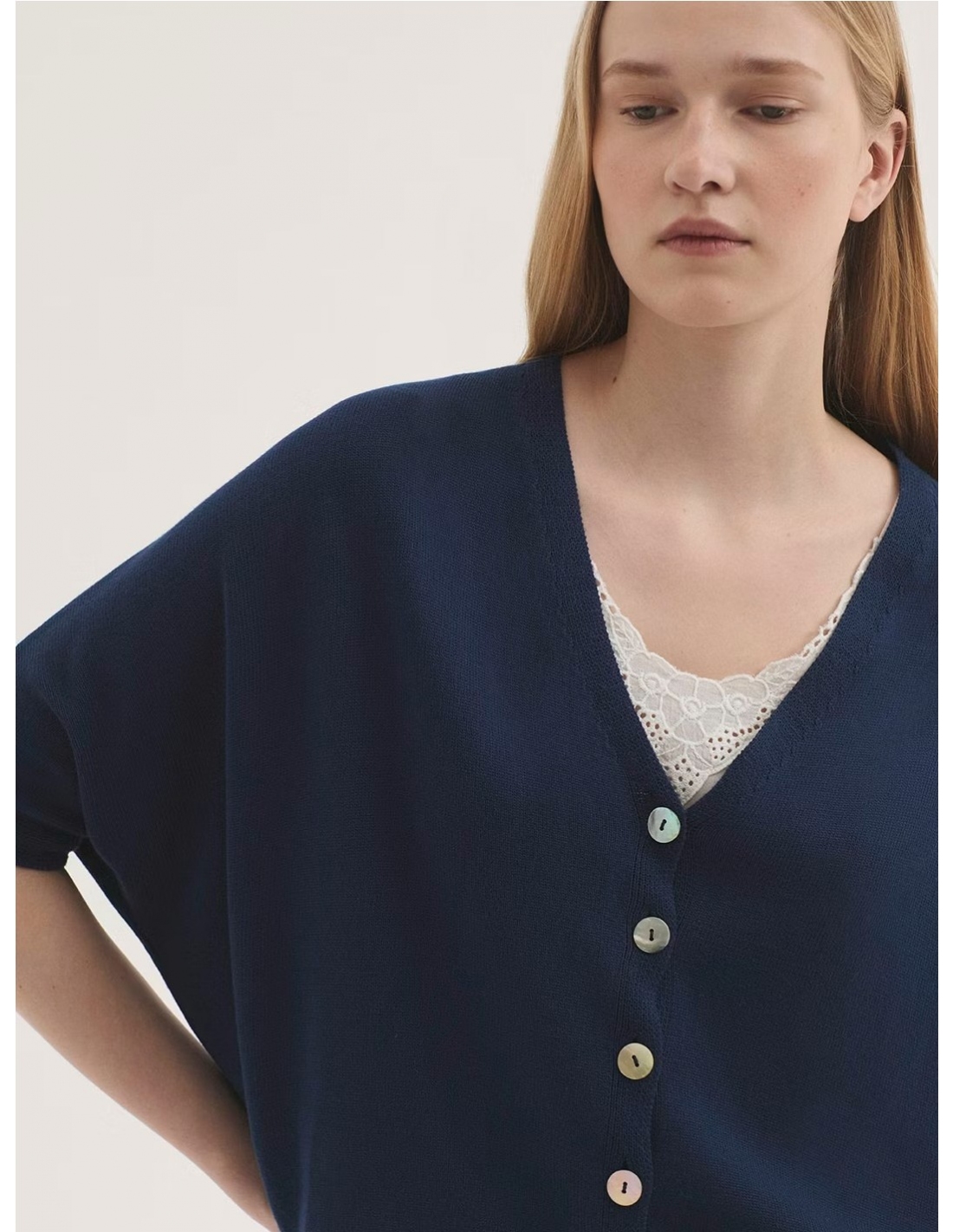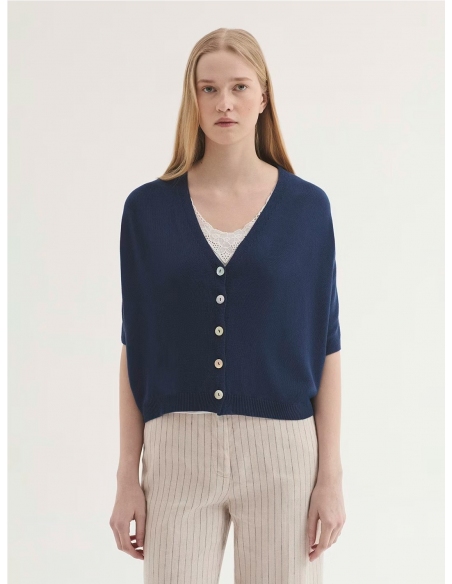 Chaqueta ancha en viscosa. Escote pico, manga corta murciélago y acabados en rib. Si dudas entre dos tallas, elige la más pequeña.