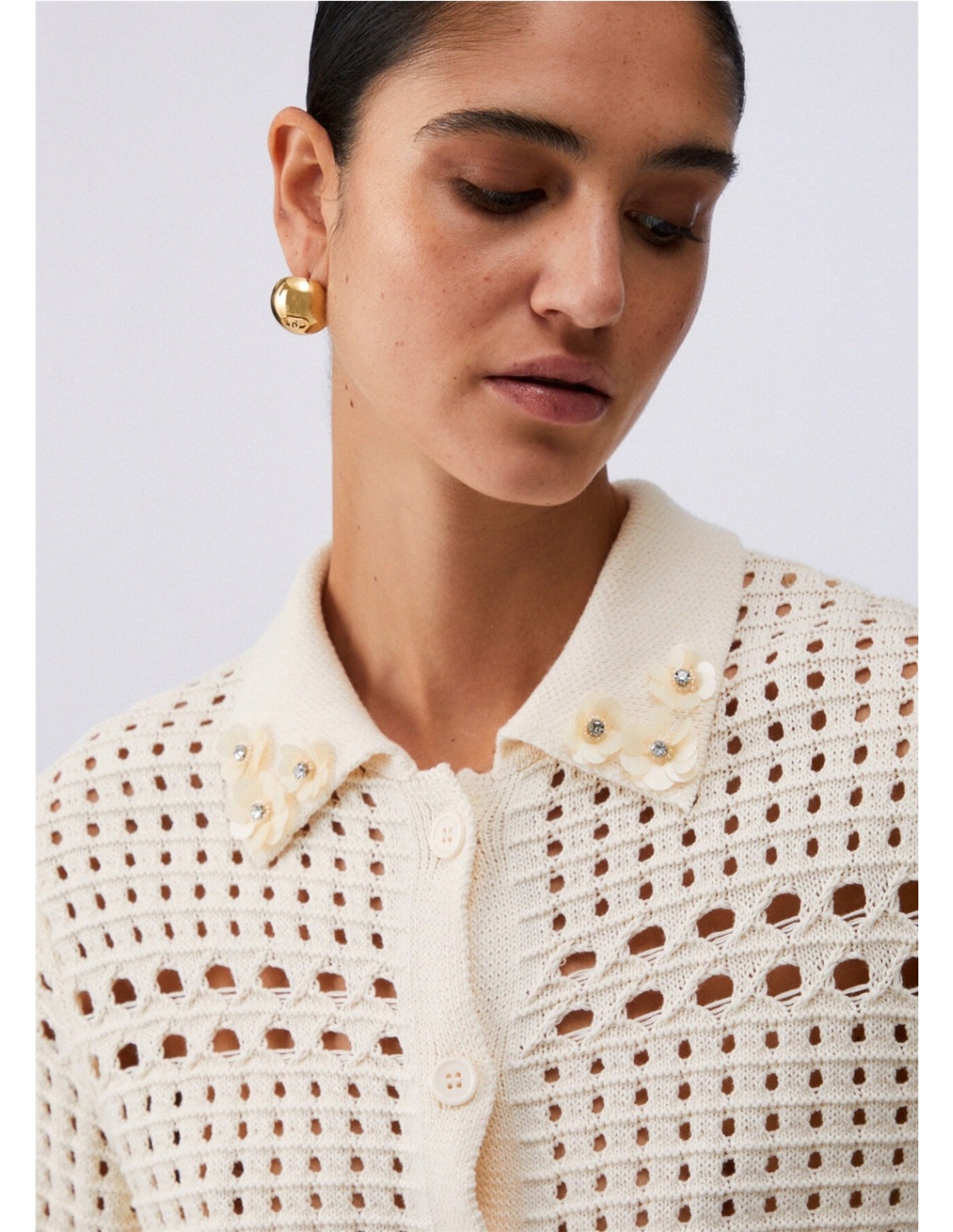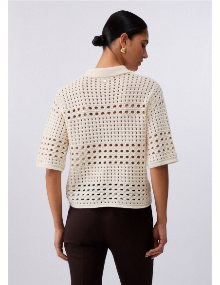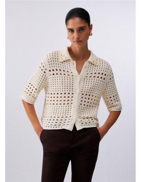 Cárdigan de crochet Hilos de algodón puro Cuello con bordados 3D Manga corta Cierre con botones del mismo tono