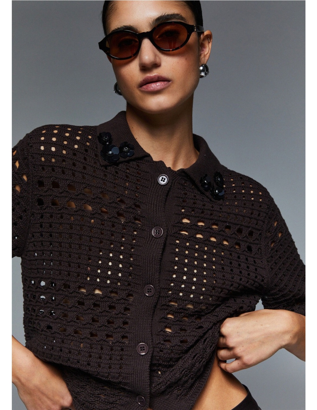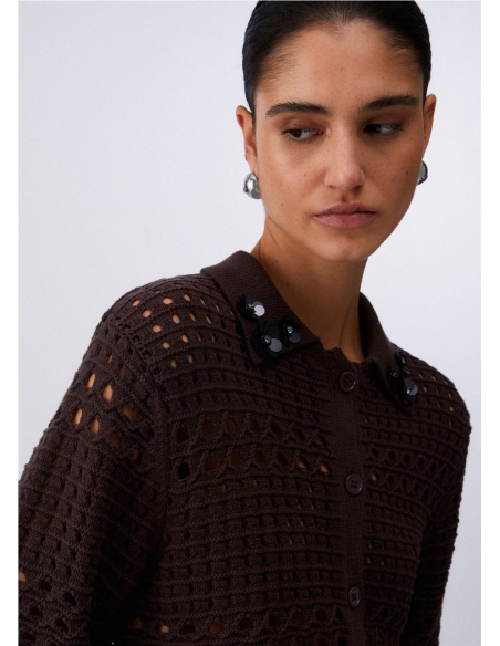 Cárdigan de crochet Hilos de algodón puro Cuello con bordados 3D Manga corta Cierre con botones del mismo tono