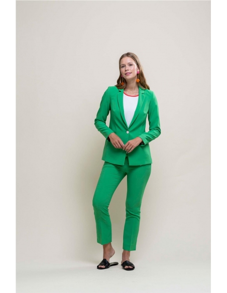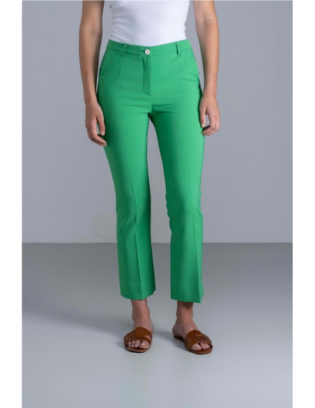 Pantalón chino ligeramente acampanado y unas pequeñas aberturas en los bajos. Trabillas en la cintura y cierre con un botón crudo y una cremallera.