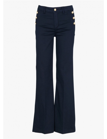 Pantalón bottom up en gabardina de algodón elástico Talle alto Pernera acampanada Bolsillos en la parte trasera Botones decorativos en los laterales Logotipo metálico en la parte trasera Etiqueta con logotipo Cierre con botón decorativo y cremallera oculta