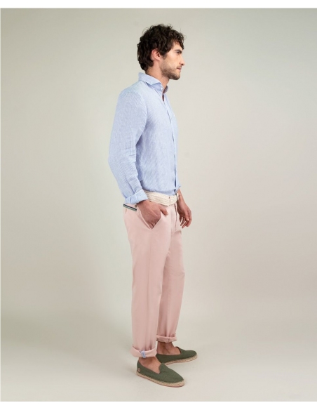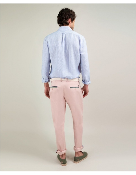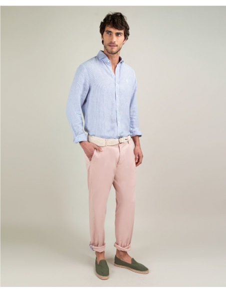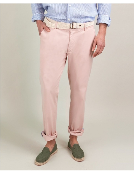 Pantalón chino confeccionado en tejido gabardina con 82% algodón, 15% de algodón reciclado y 3% elastano. Lleva un lavado final con enzima ácida lo que le da un aspecto desgastado. Corte Slim Fit, cierre mediante cremallera oculta por tapeta y botón. Tiene bolsillos delanteros y en los traseros lleva vivos a contraste. Tiene el chapón del logo cosido encima del bolsillo trasero. Incluye cinturón de canvas.