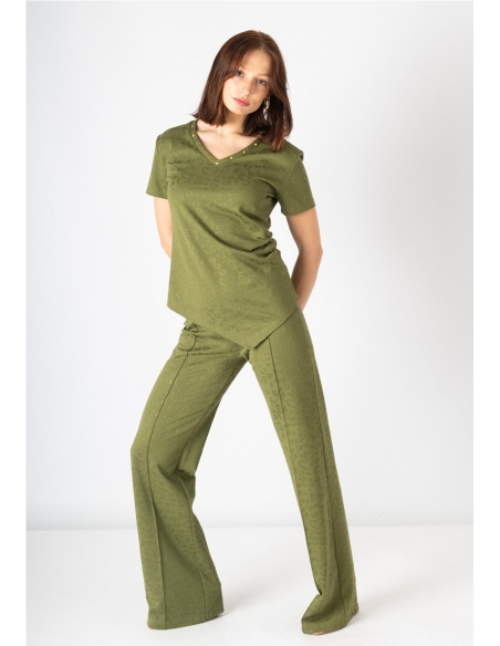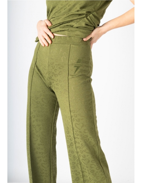 Pantalón verde con un sutil animal print exclusivo de la marca. Recuerda que "El coraje no siempre ruge. A veces es la voz tranquila al final del día que dice: 'Lo intentaré de nuevo mañana”. " – Mary Anne Radmacher