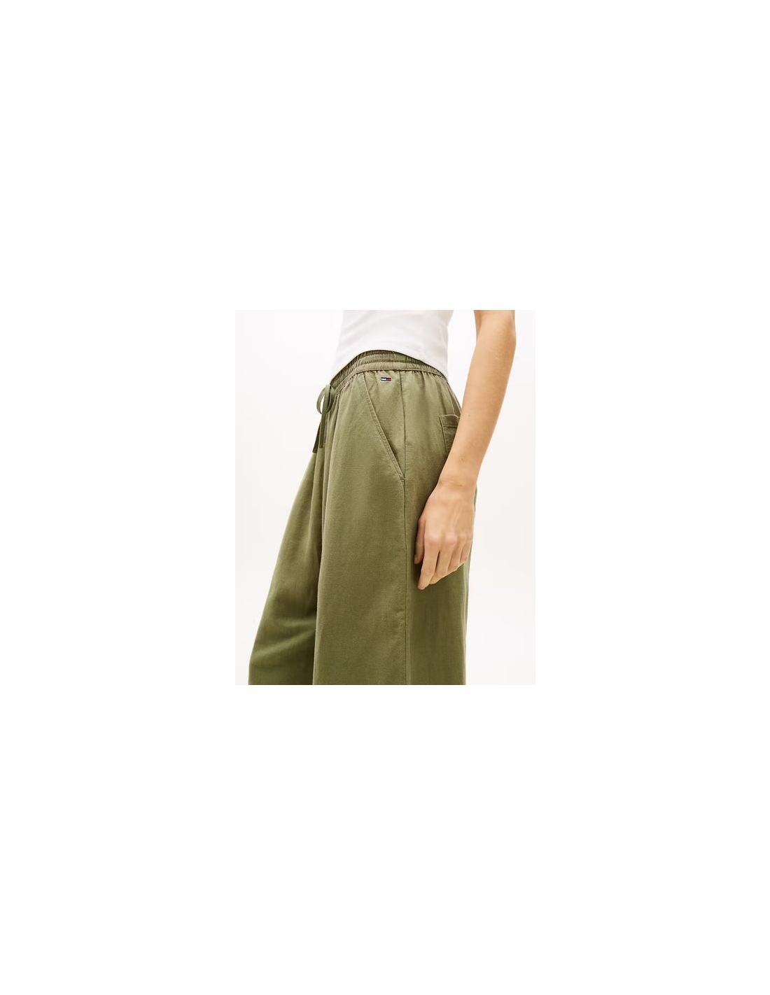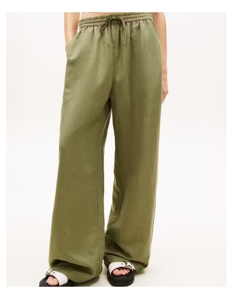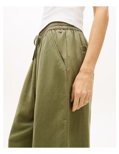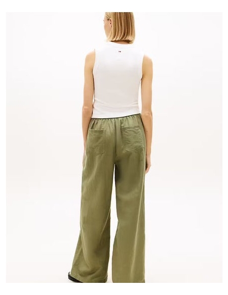 Este refinado pantalón con cordón en la cintura es perfecto para tus looks informales los días soleados. Características • Mezcla de lino • Cintura elástica con cordón • Dos bolsillos laterales ribeteados • Dos bolsillos traseros de parche • Detalles distintivos de Tommy Jeans • Bordado del logo de Tommy en la cadera