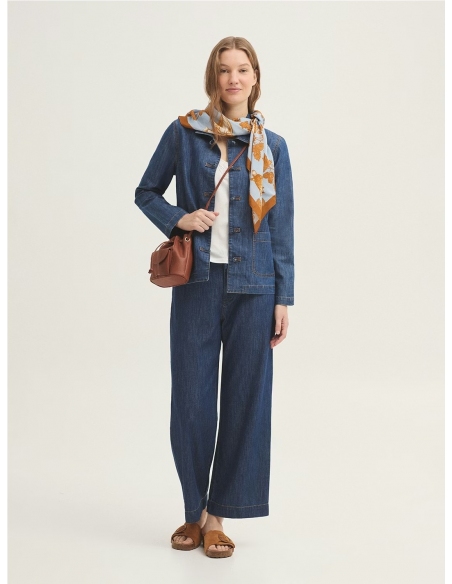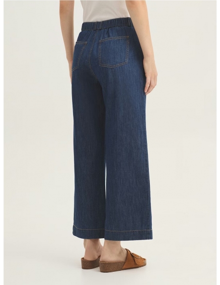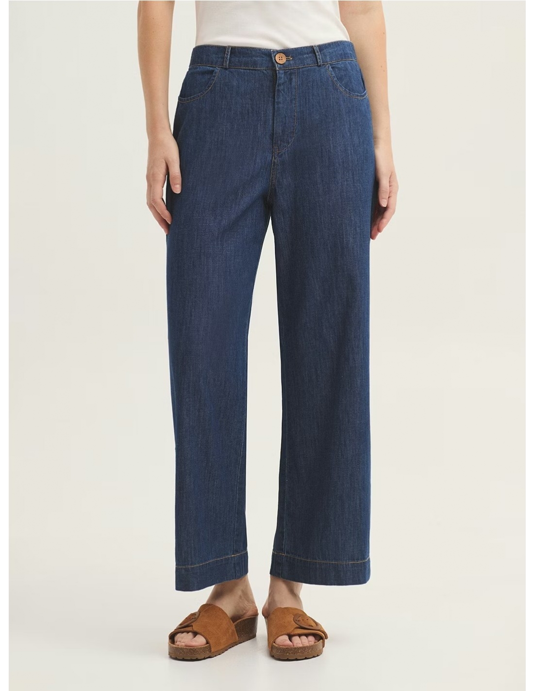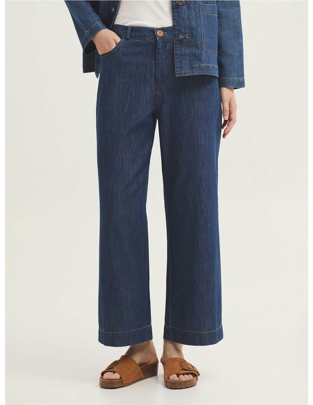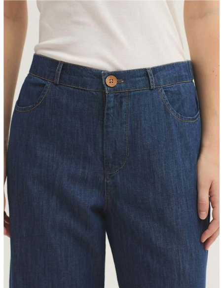 Pantalones vaqueros de mezclilla confeccionados en algodón sostenible. Cuentan con bolsillos delanteros tipo "snack", cremallera metálica y cierre de botón de coco en la parte delantera. Cintura con trabillas para cinturón, cintura elástica oculta en la parte trasera y bolsillos de parche. Pierna ancha.
