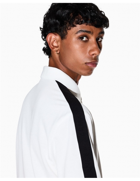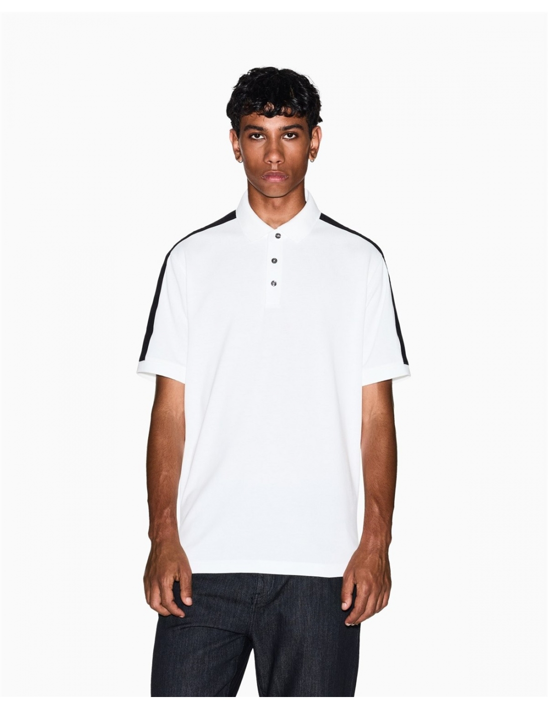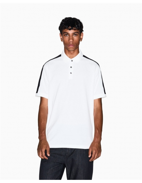 Este polo de silueta recta se integra en el entorno urbano, permitiendo libertad de movimiento. El cuello tradicional incluye un cierre de tres botones que organiza la estructura frontal. En los hombros, unas cintas aplicadas resaltan la construcción con un detalle gráfico. Sus mangas cortas facilitan la movilidad, logrando un diseño de líneas limpias y funcionales. Su confección en tejido de algodón piqué presenta una textura característica que favorece la transpirabilidad. Los remates de canal