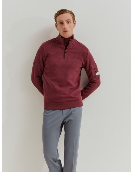 Suéter de manga larga con cremallera frontal, perfecto para el día a día, fácil de poner y práctico. Cuenta con un bolsillo en la manga con cremallera y cursor personalizado, además de una etiqueta personalizada en contraste que le da un toque distintivo. La cremallera frontal con cursor en contraste permite un ajuste rápido y cómodo, lo que le da un toque funcional y elegante.