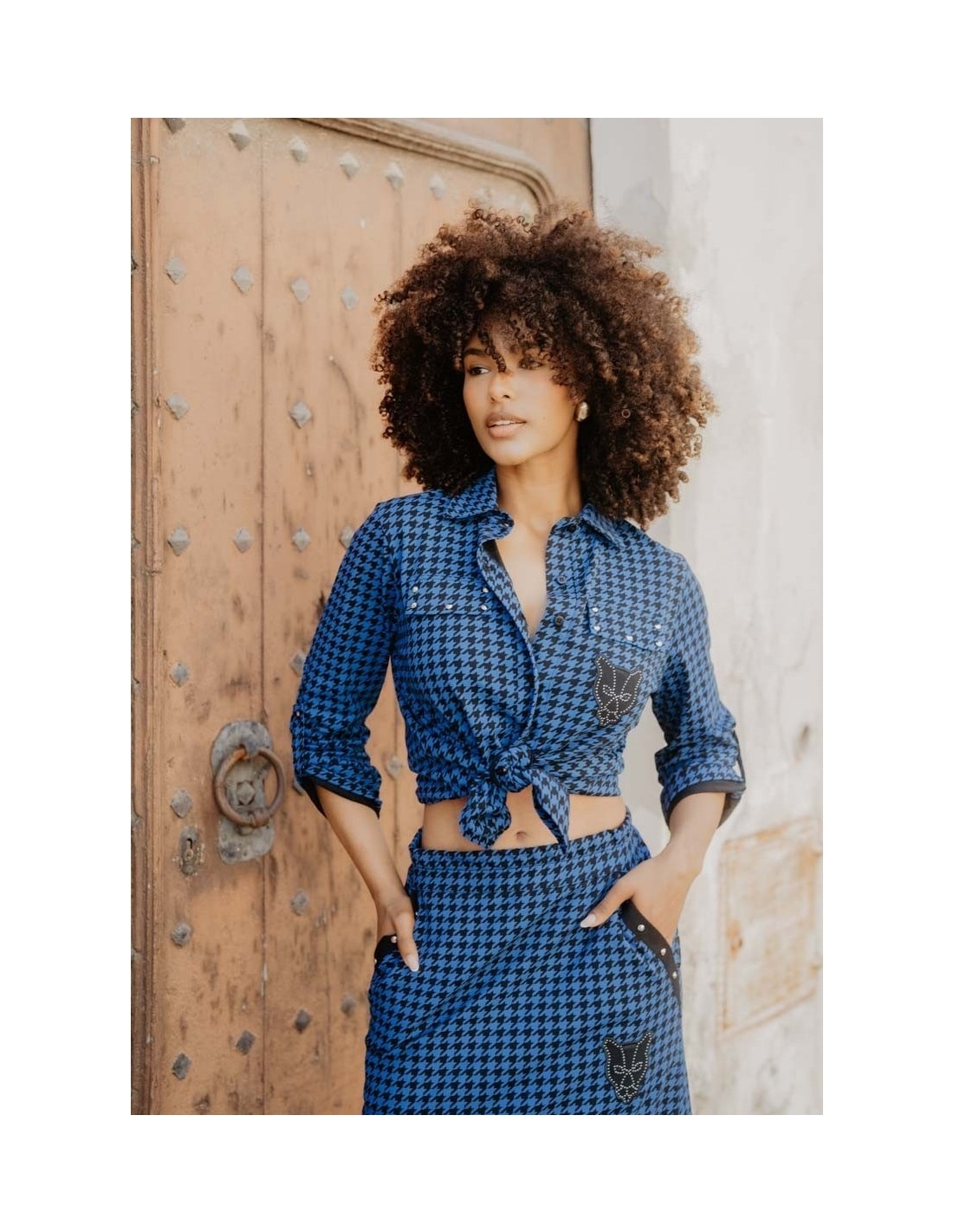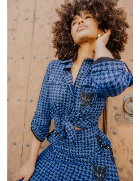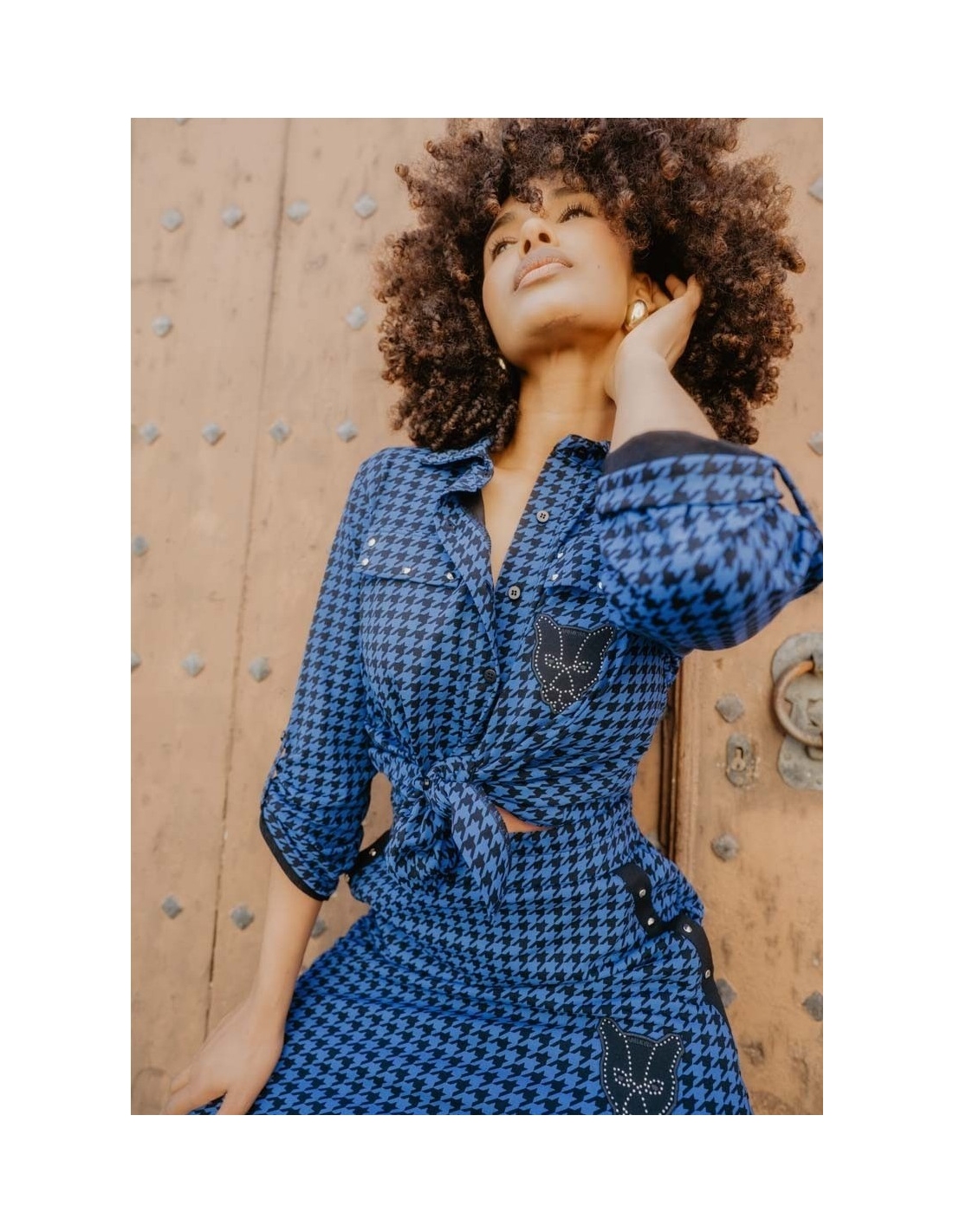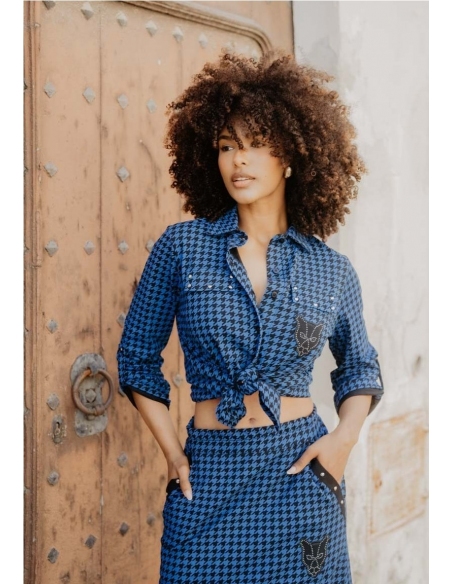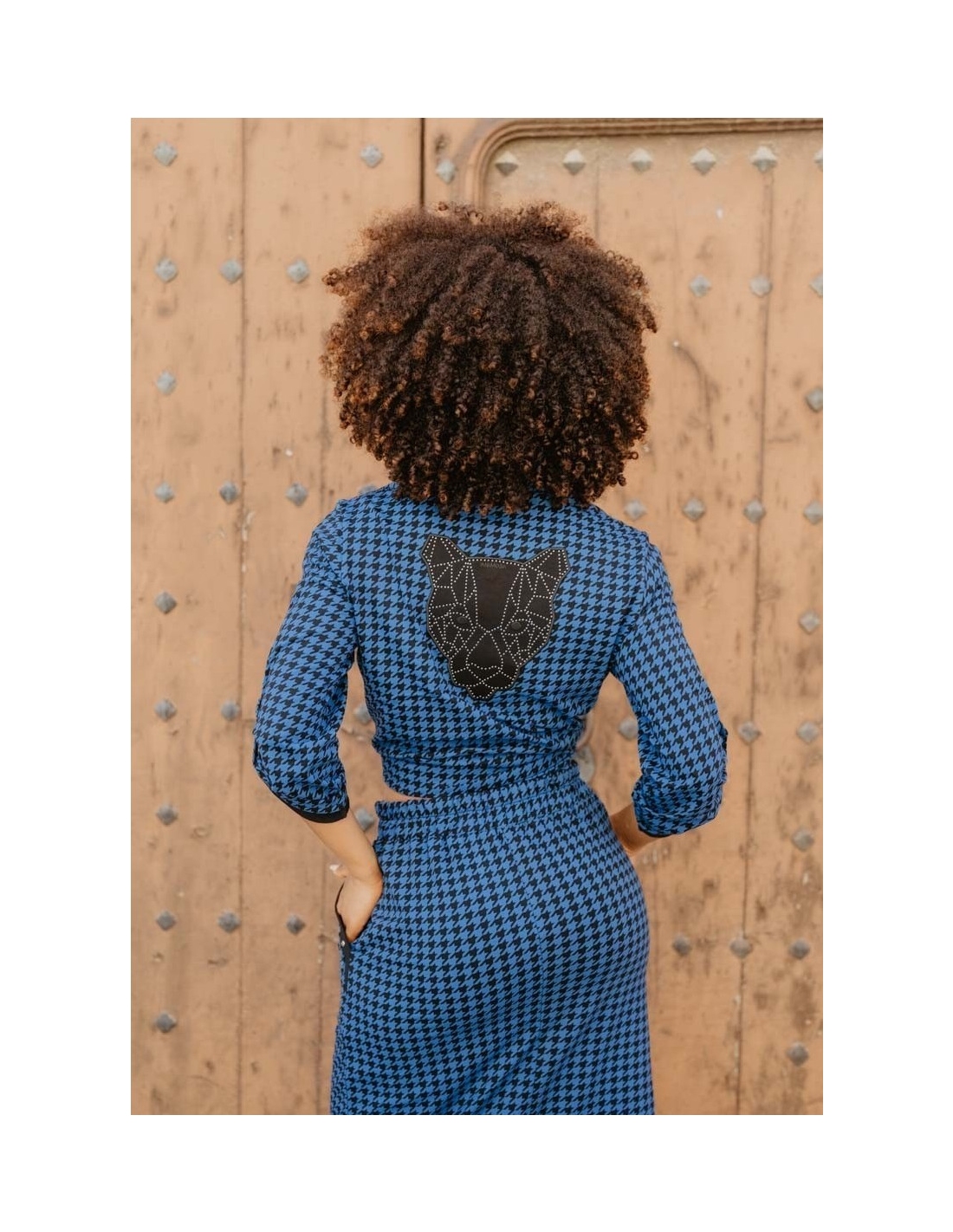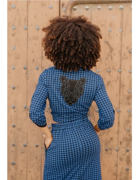 Camisa azul con estampado de pata de gallo, falsos bolsillos en el pecho y tachuelas en la tapeta. Con trabilla para recoger las mangas. En el pecho y la espalda: una pantera negra en una tela superpuesta, bordada en su contorno. Los ojos son bordados y una hilera de tachuelas forma la estructura interna.
