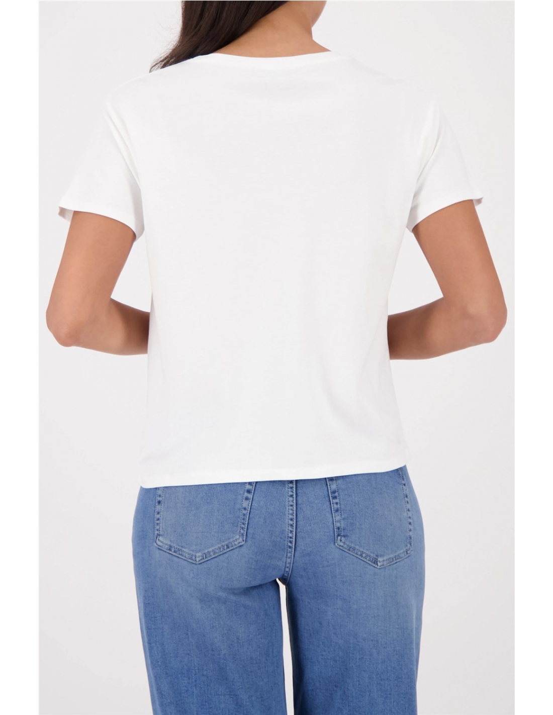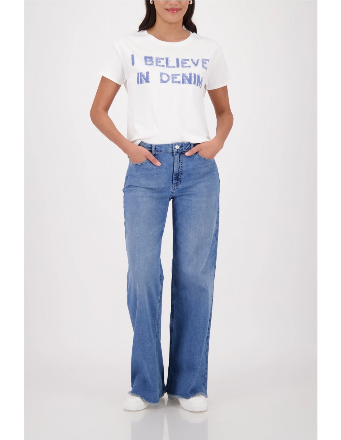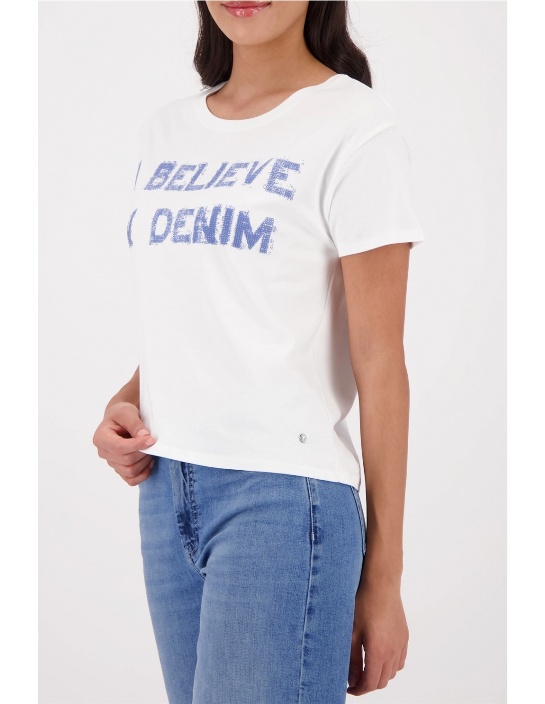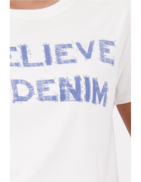 Elegante camiseta confeccionada en 100% algodón con letras "I believe in Denim", pedrería, textura suave y escote redondo.