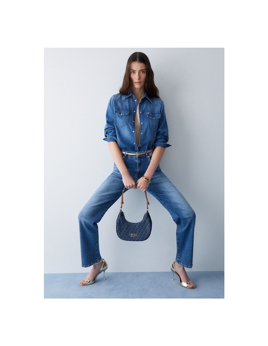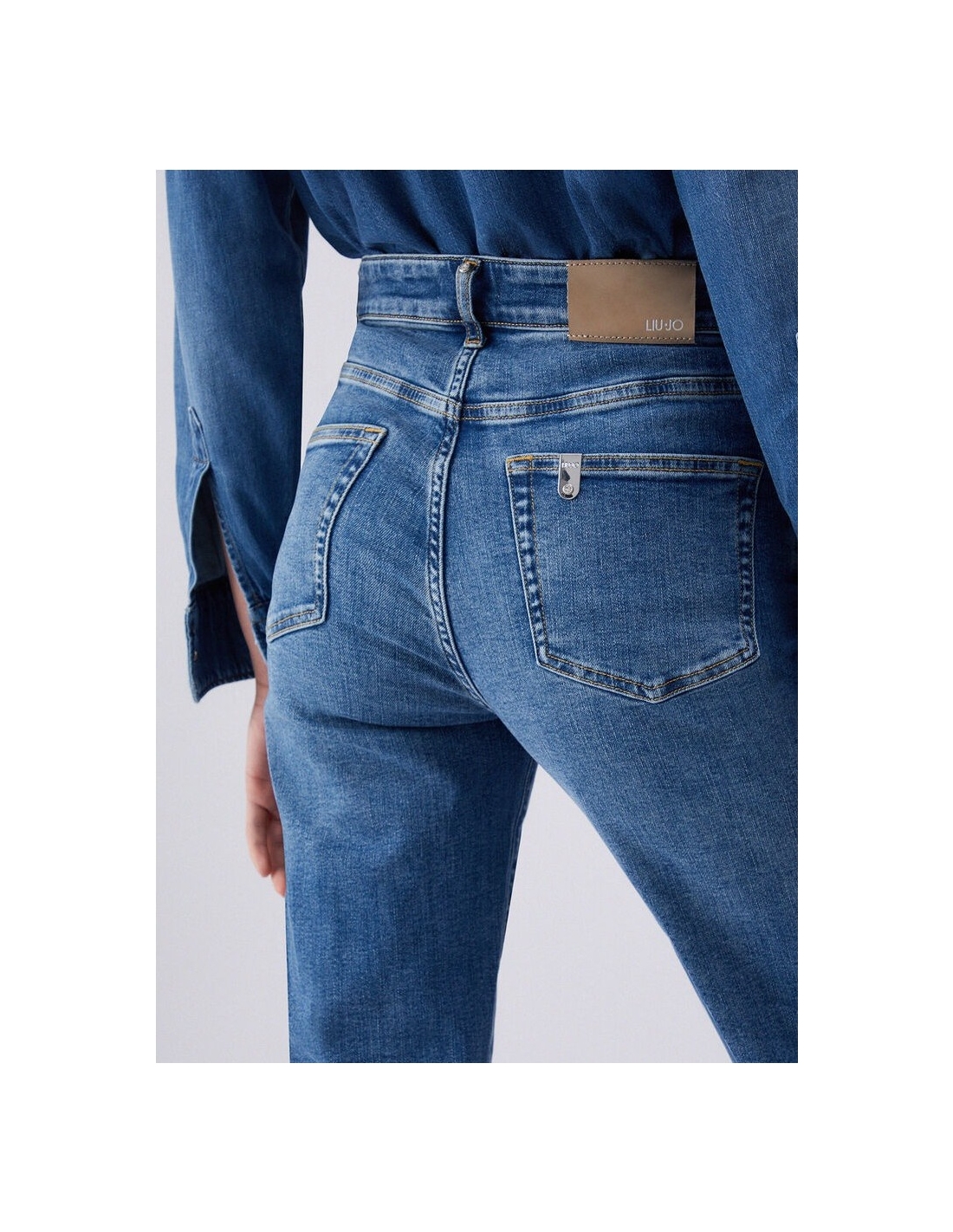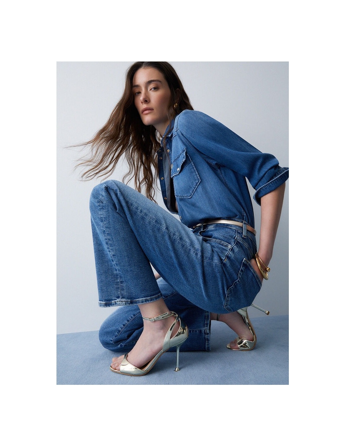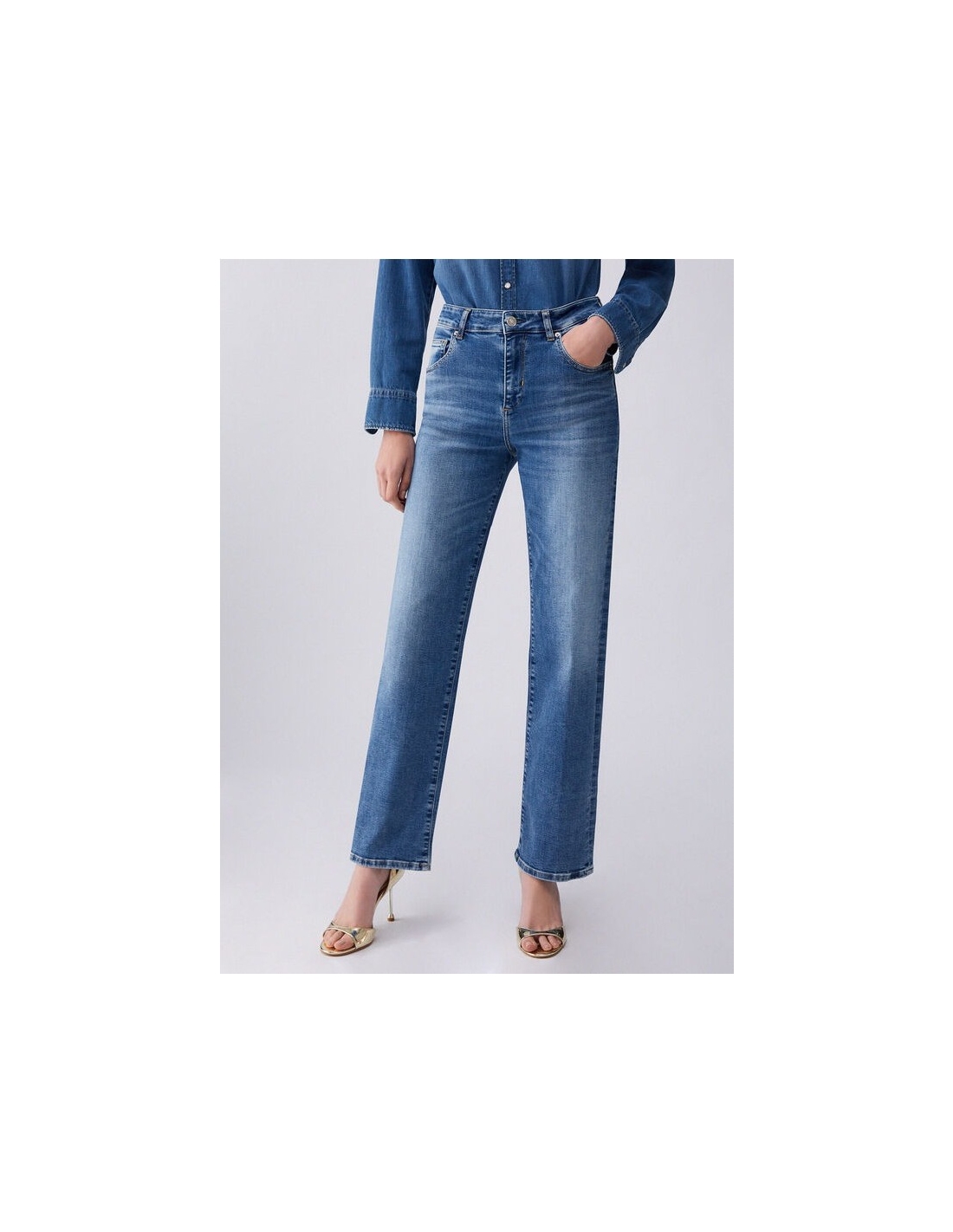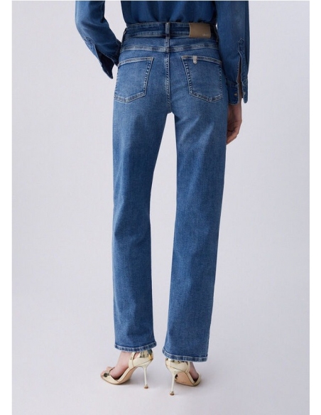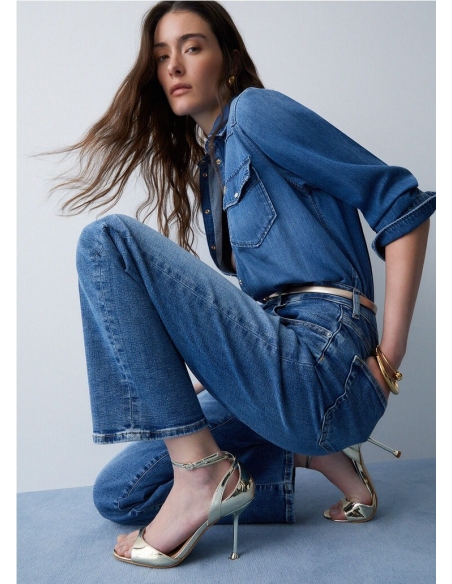 Vaqueros de denim elástico Lavado stonewash con bigotes y rasguños Modelo de cinco bolsillos Cintura alta Pierna recta Cierre con cremallera y botón Longitud de la pierna: 80 cm Ancho del bajo: 24 cm