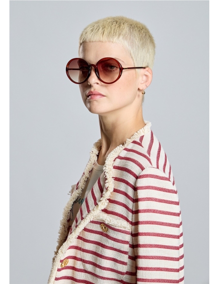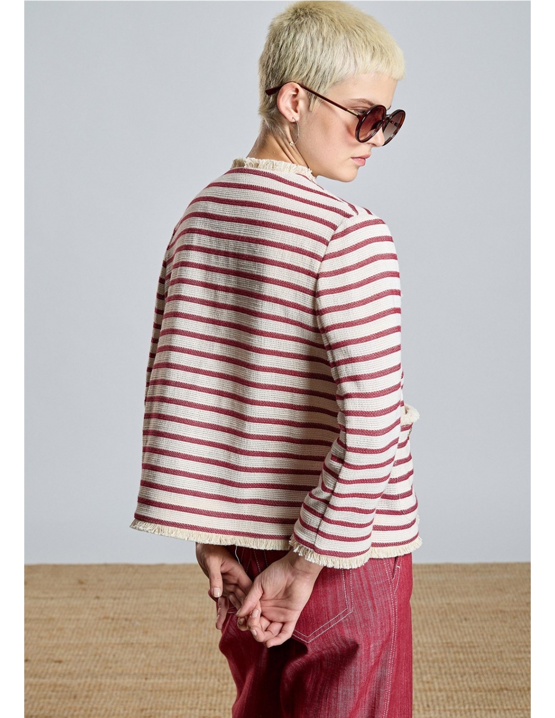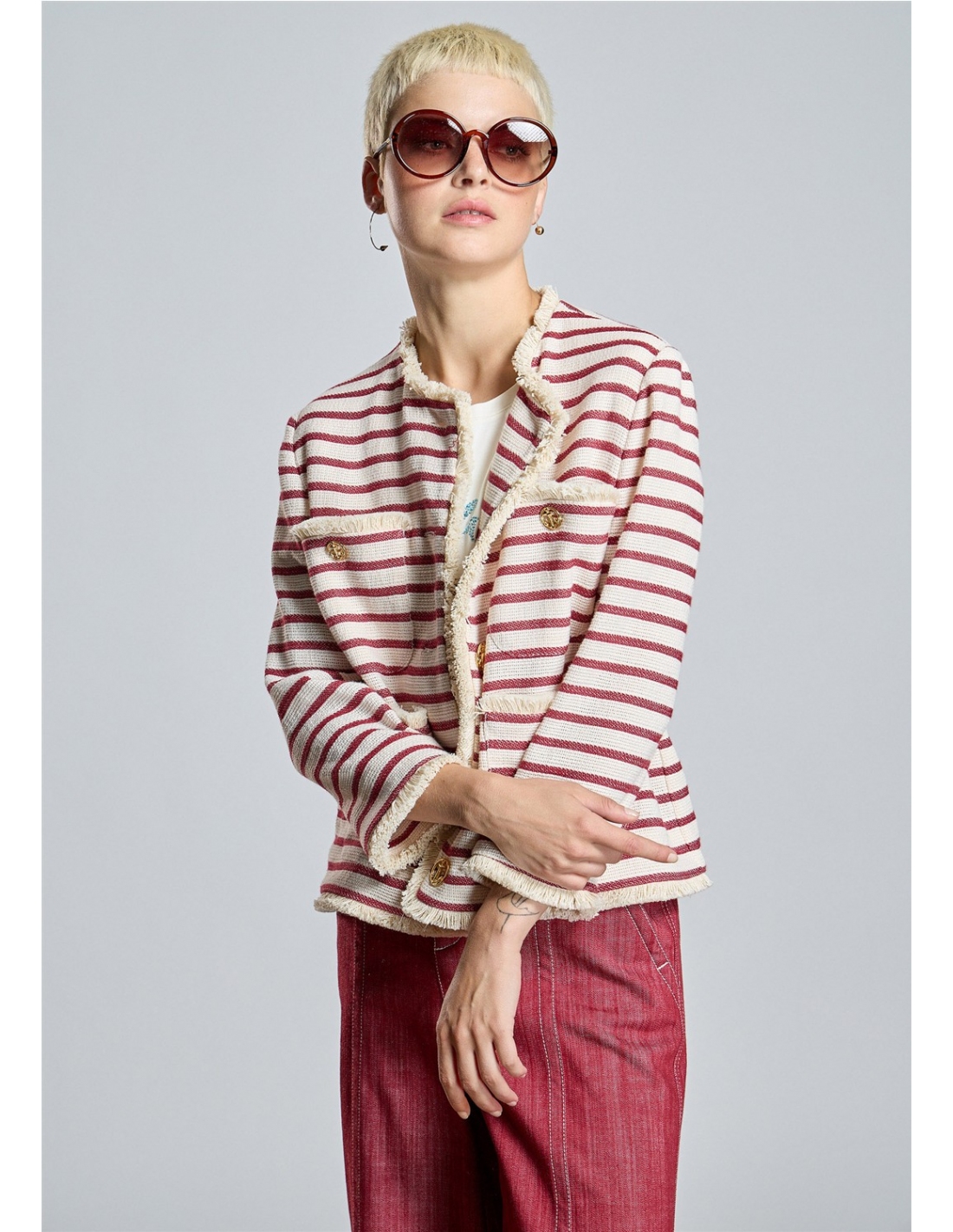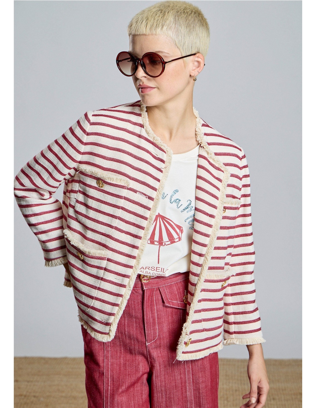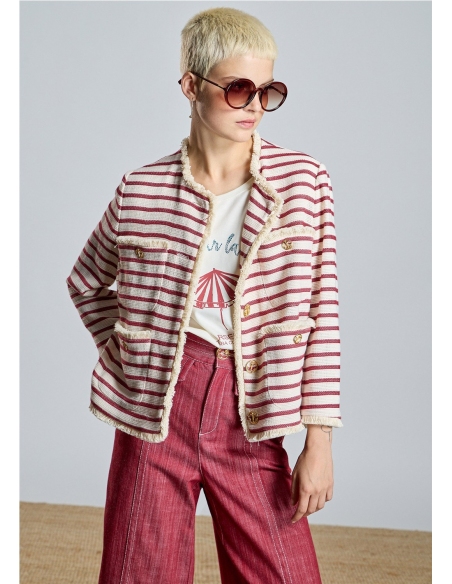 Eleva tu estilo con esta exclusiva chaqueta de inspiración náutica firmada por Alba Conde. Confeccionada en un tejido estructurado de rayas granates sobre fondo crudo, esta prenda destaca por su sofisticado acabado desflecado en bordes y bolsillos. Los botones metálicos dorados con grabado de ancla aportan el toque definitivo de distinción. Una pieza versátil y atemporal, perfecta para dar un aire chic a tus looks de entretiempo.