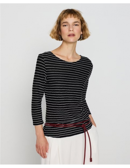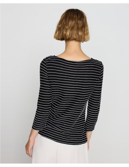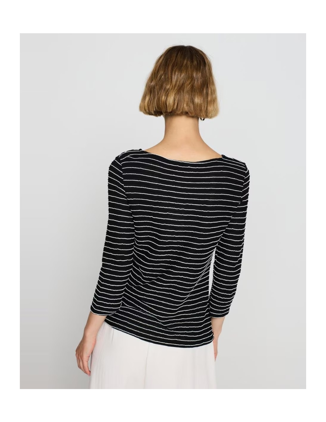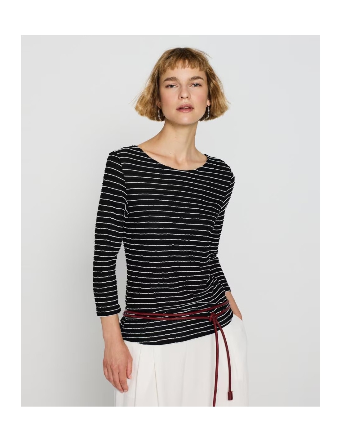 La camiseta Elara presenta un diseño clásico a rayas con mangas 3/4, combinando comodidad y estilo de manera única. Su corte moderno y versátil la hace ideal para crear looks casuales con un toque de frescura. Perfecta para añadir un aire relajado y chic a tu guardarropa.