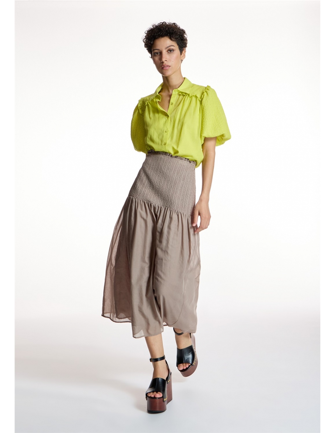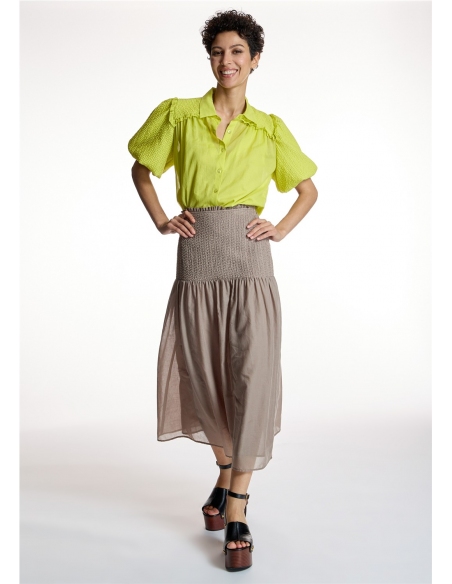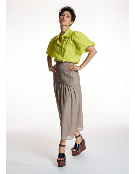 Falda midi ALBA CONDE con silueta fluida que aporta movimiento. Presenta cintura alta con detalle d fruncido elástico, lo que permite adaptar la prenda y realzar la figura. Presenta cierra lateral con cremallera invisible. Una falda atemporal, fácil de combinar y perfecta para el armario diario.