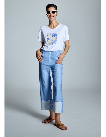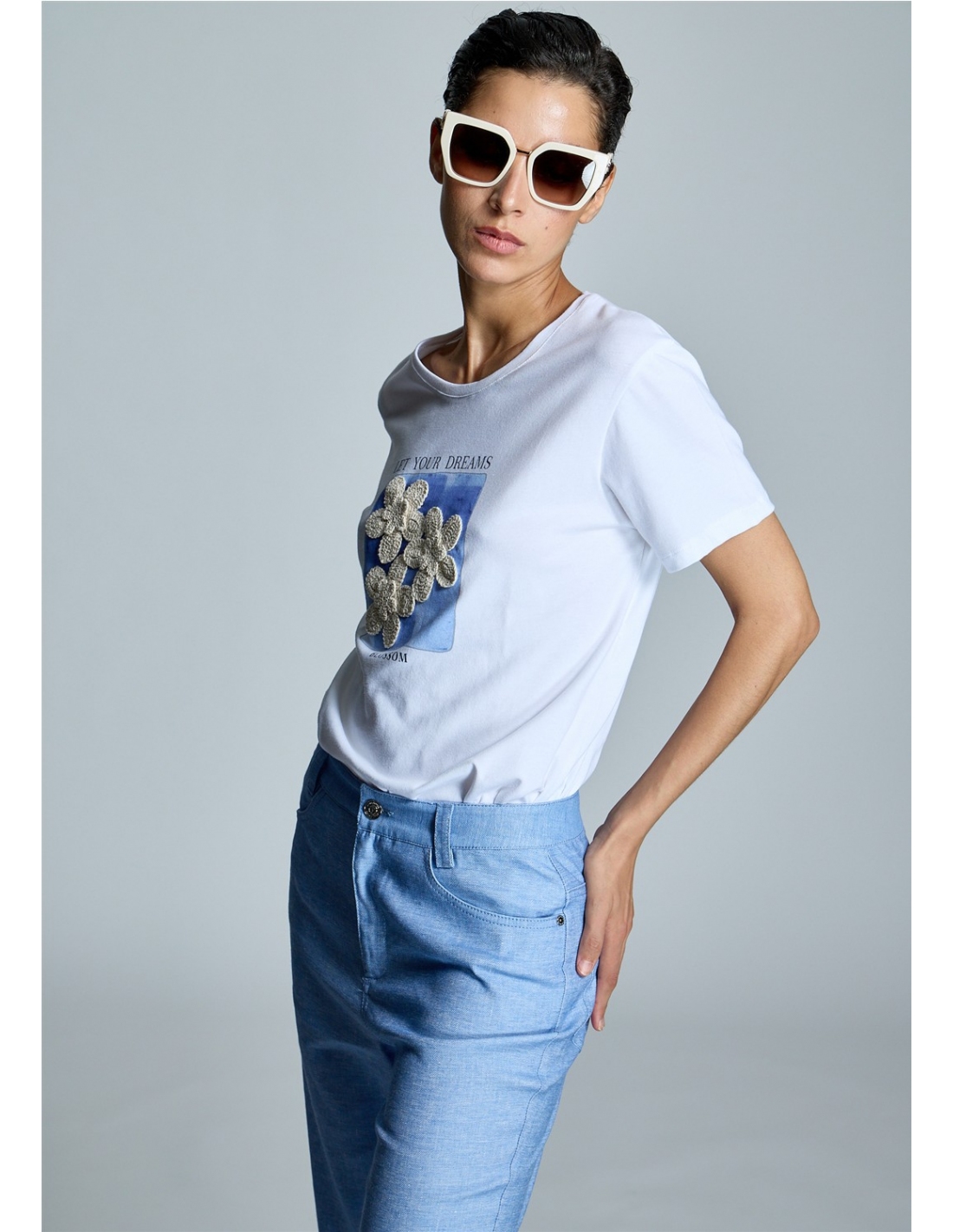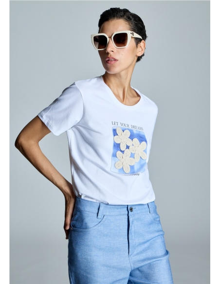 Camiseta ALBA CONDE con aplique frontal. Diseño semiajustado con cuello redondo y manga corta, que proporciona un ajuste cómodo y favorecedor. Presenta un detalle distintivo en la parte delantera que le da un toque único. Una camiseta versátil y atemporal, perfecta para looks casuales con estilo.