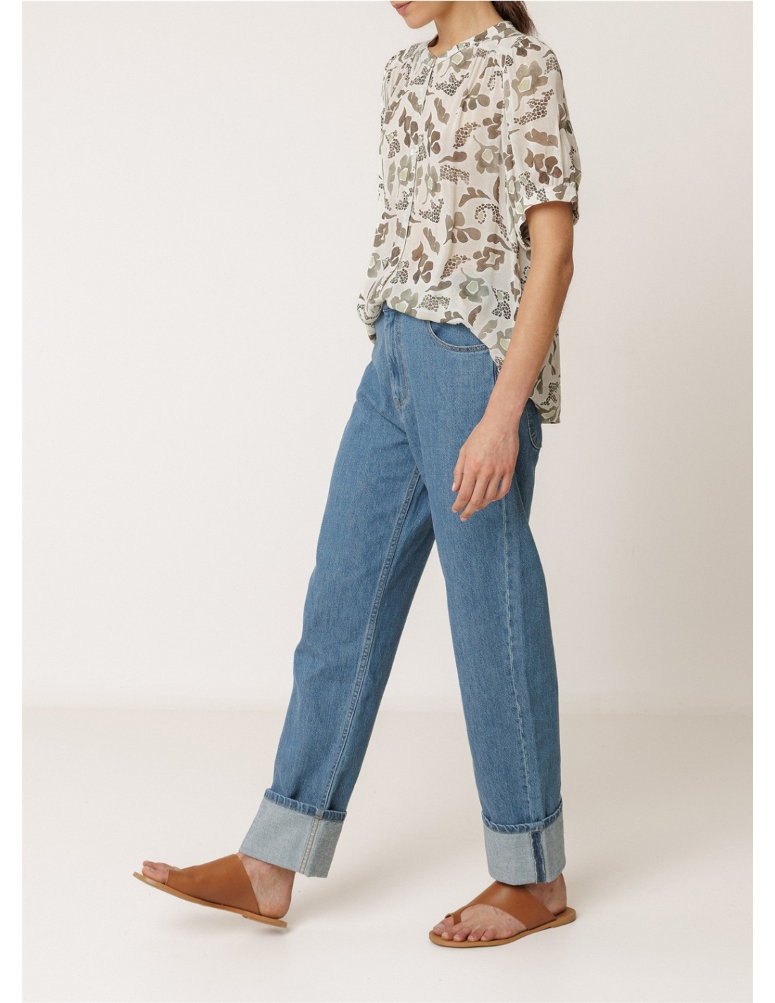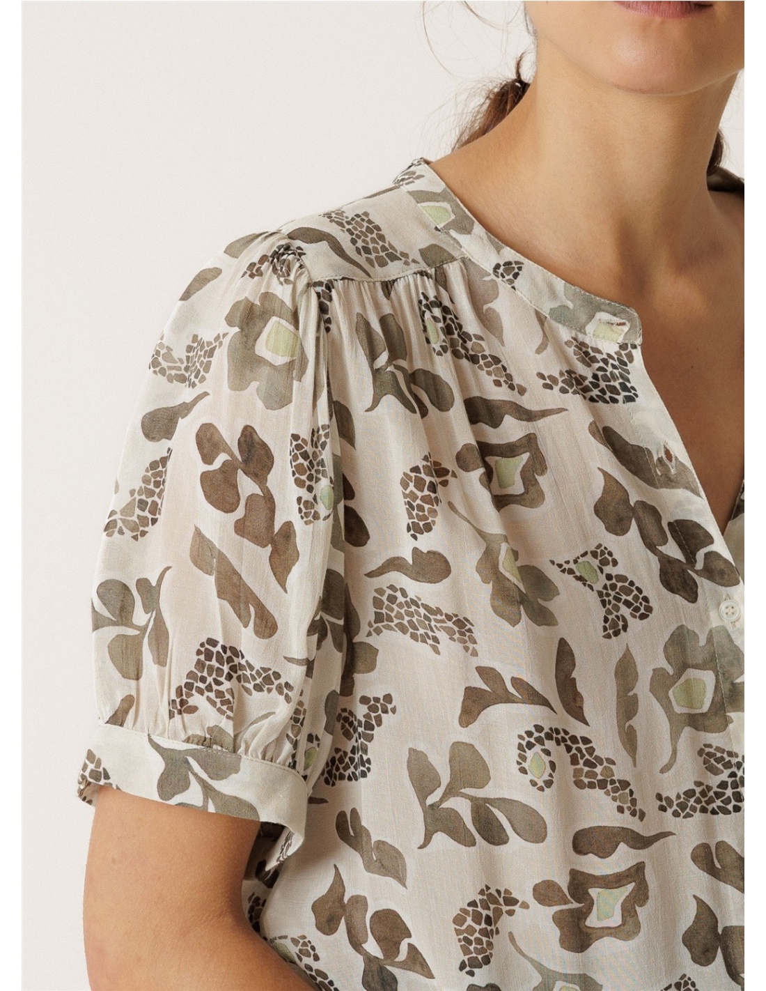 • Hombros ajustados y mangas cortas ligeramente abullonadas. • Cierre de botones en la parte delantera. • Tejido de gasa de viscosa duradera con estampado acuarela maxi, ligeramente transparente. • Corte regular: diseñado para un ajuste estándar. Tamaño normal. Te recomendamos tu talla habitual.