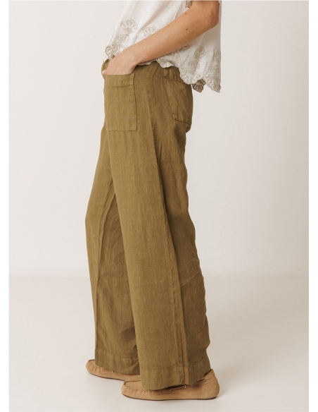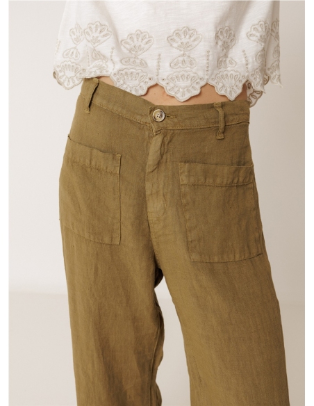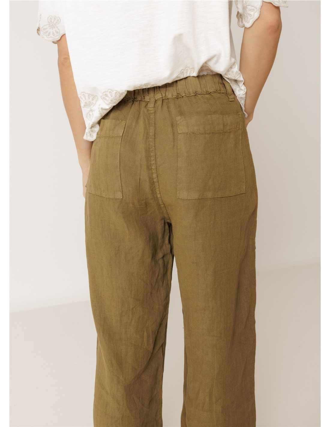 • Tiro alto con cinturilla elástica en la espalda. • Cierre con cremallera y botón. • Bolsillos de parche delanteros y traseros. • Tejido 100 % lino. • Corte regular: diseñado para un ajuste estándar. Tallaje normal. Recomendamos tu talla habitual.