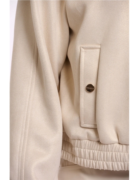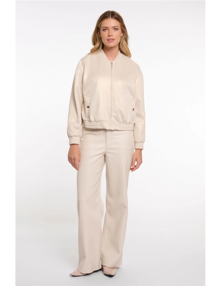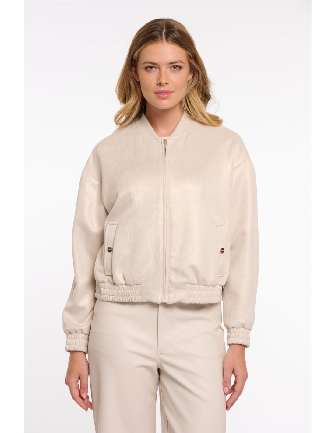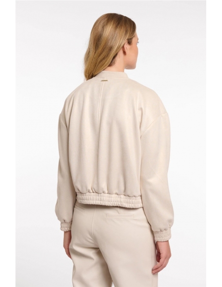 Una versión lujosa de la silueta bomber, confeccionada en un suave tejido de ante con un corte relajado y ligeramente corto. Diseñada con puños y bajo elásticos, un elegante cierre de cremallera y un discreto cuello alto, combina comodidad con un estilo refinado.