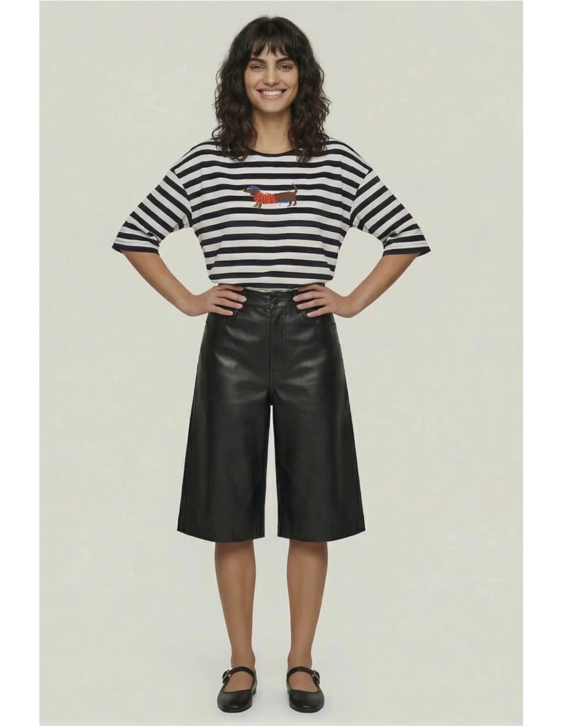 Esta camiseta marinera de rayas horizontales blancas y negras se transforma en pieza irresistiblemente encantadora mediante el bordado artesanal de un perrito salchicha (dachshund, teckel) con suéter rojo y collar azul en el pecho.