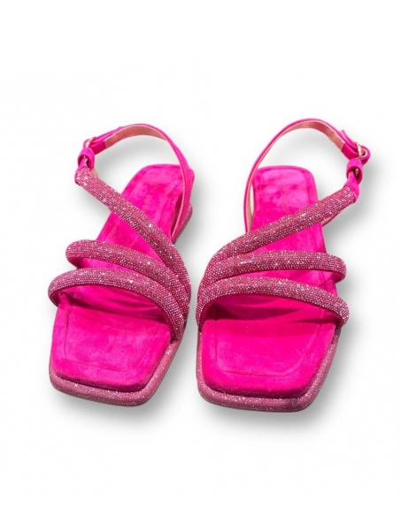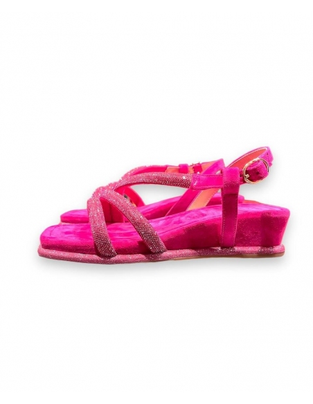 Sandalia de tacón tipo cuña de mujer, tiras con pedrería. Cierre con hebilla y puntera cuadrada. La altura del tacón es de 5cm.
