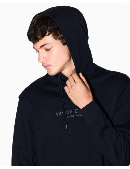 Sudadera con capucha de algodón suave, una prenda icónica de estilo casual que no puede faltar en tu armario. Esta sudadera destaca por su diseño esencial y la sofisticada inscripción "Armani Exchange Milano / New York" impresa tono sobre tono en el pecho, un detalle que le aporta un toque de discreta elegancia. La capucha con cordón ajustable, las mangas largas y los detalles acanalados garantizan una comodidad óptima y un ajuste impecable.