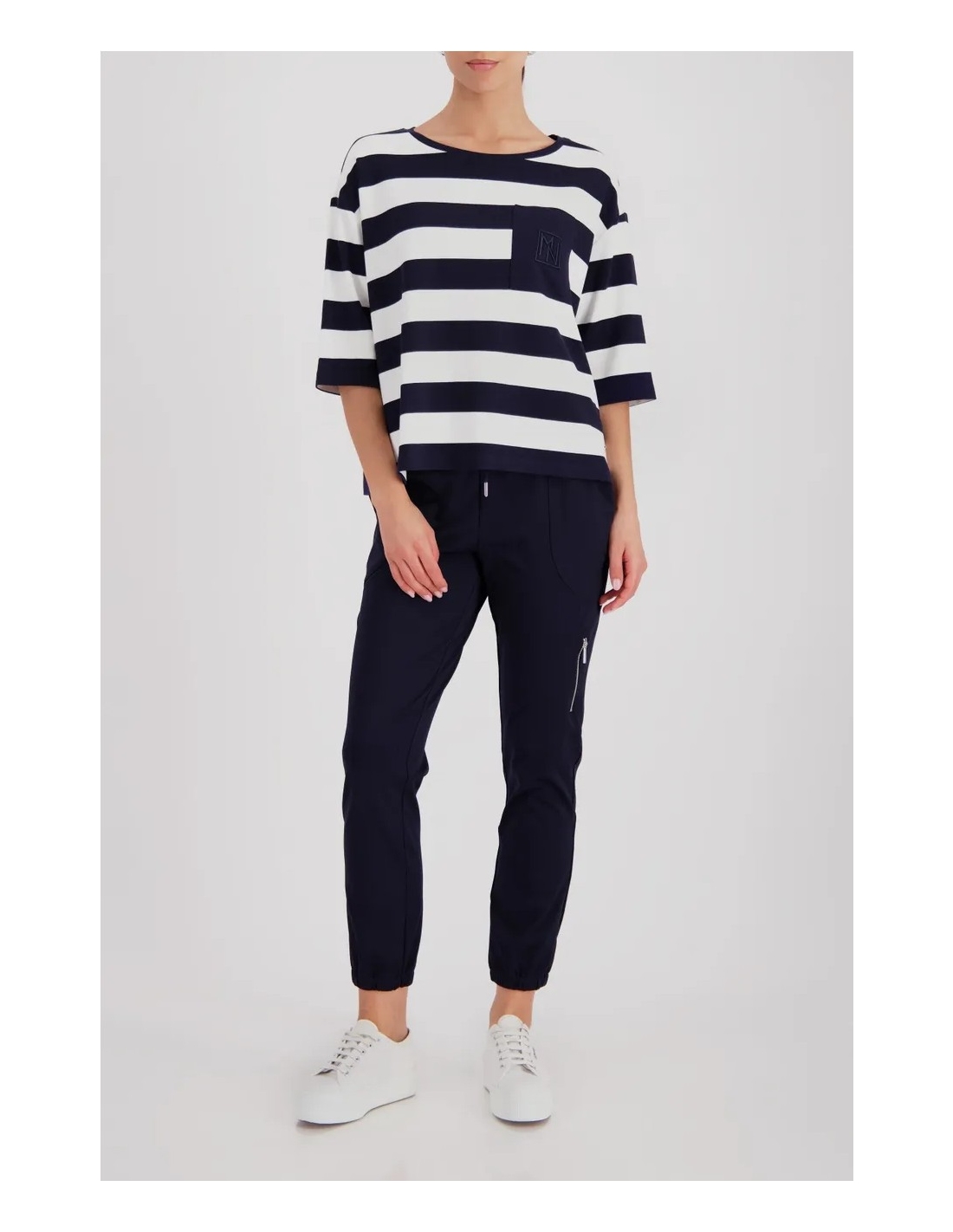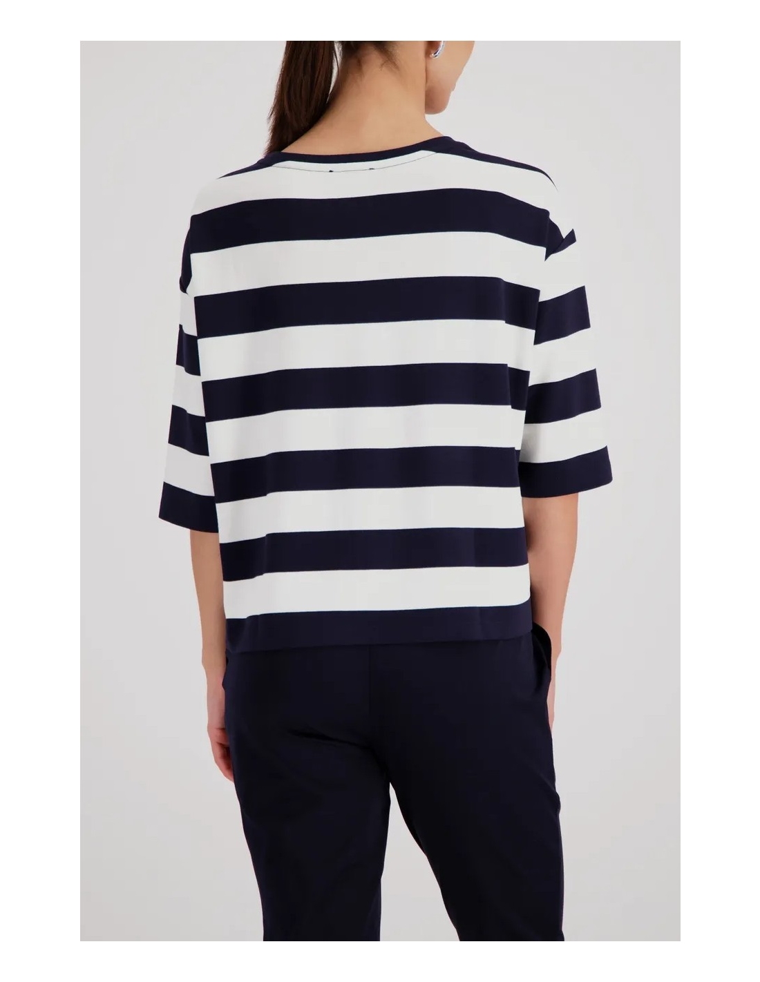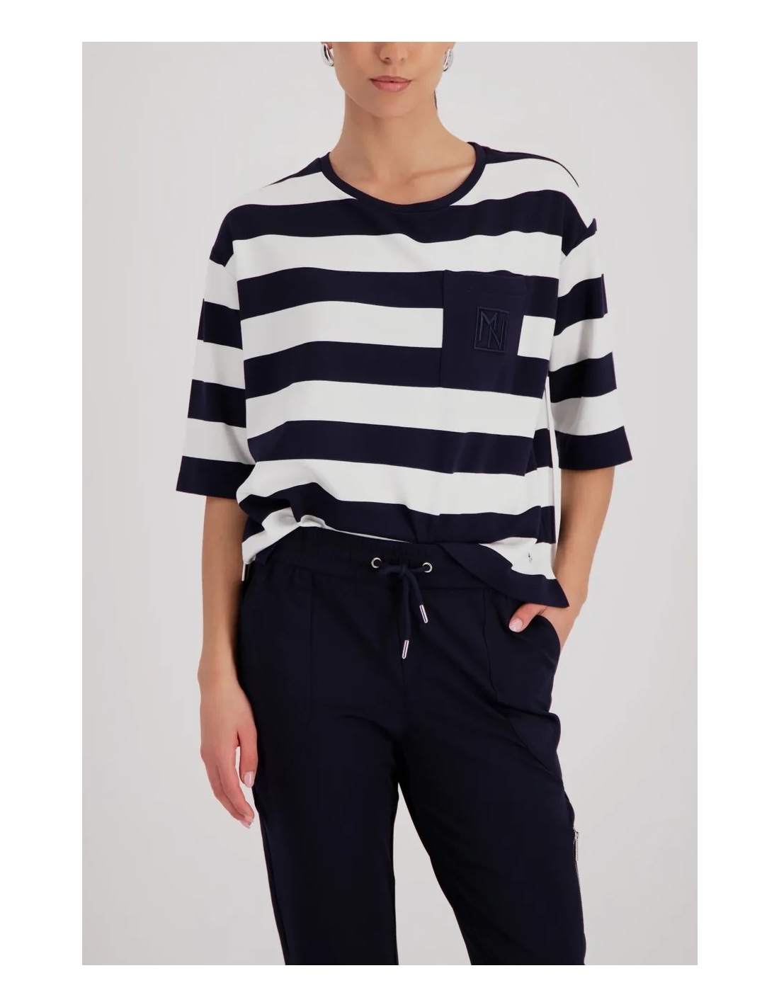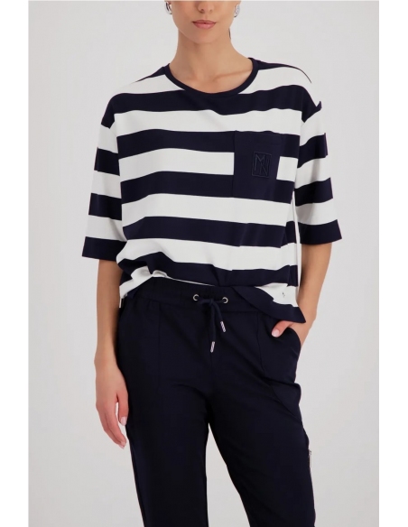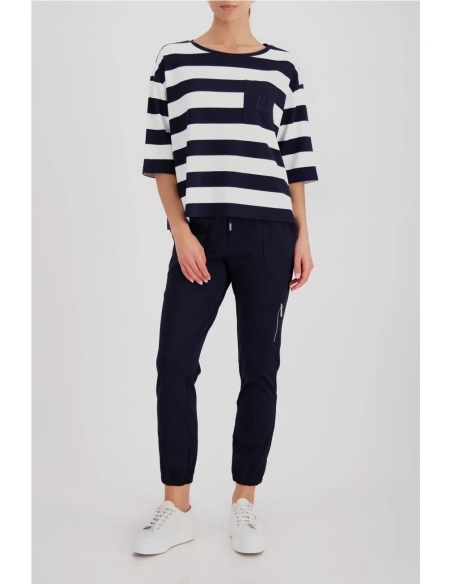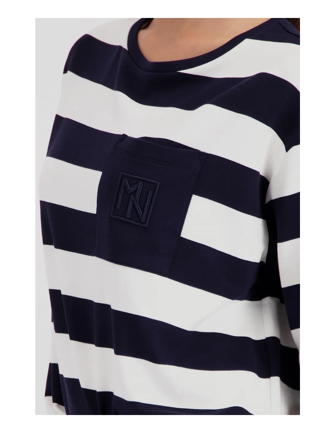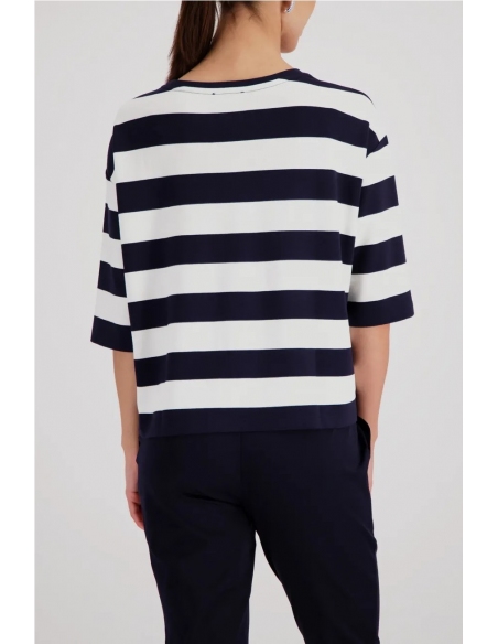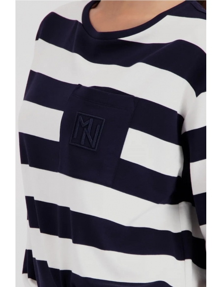 Sudadera elegante confeccionada en viscosa fluida con delicados bordados en el bolsillo del pecho y rayas.