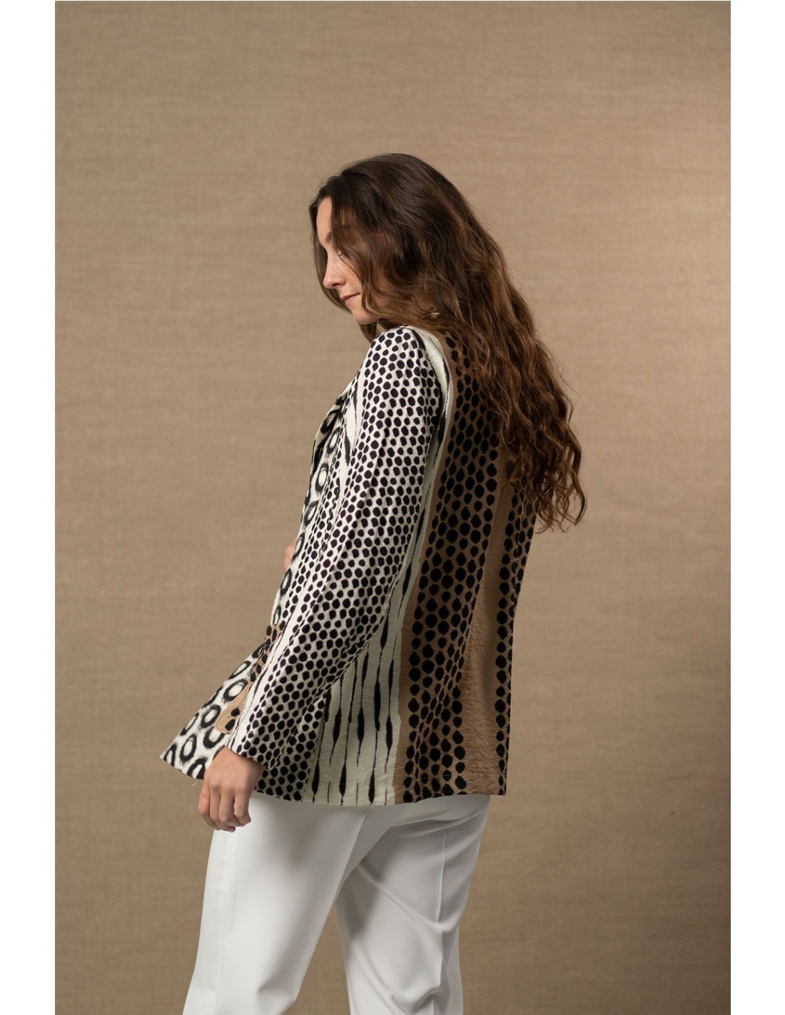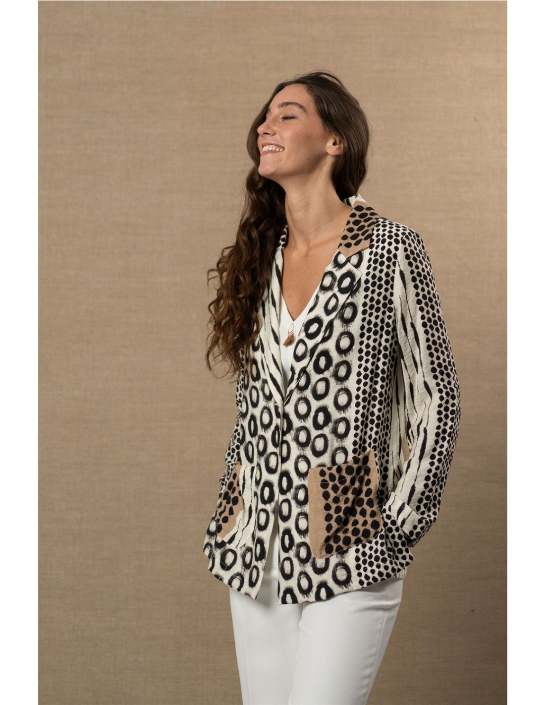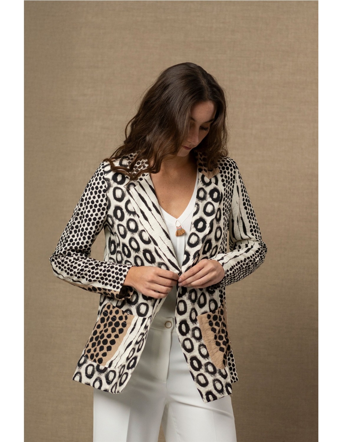 Una americana que no pasa desapercibida. Este diseño combina diferentes grafismos en un juego visual equilibrado que aporta personalidad sin perder elegancia. Su tejido fluido suaviza la estructura clásica de la americana, creando una silueta cómoda, ligera y fácil de llevar en el día a día.