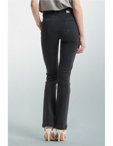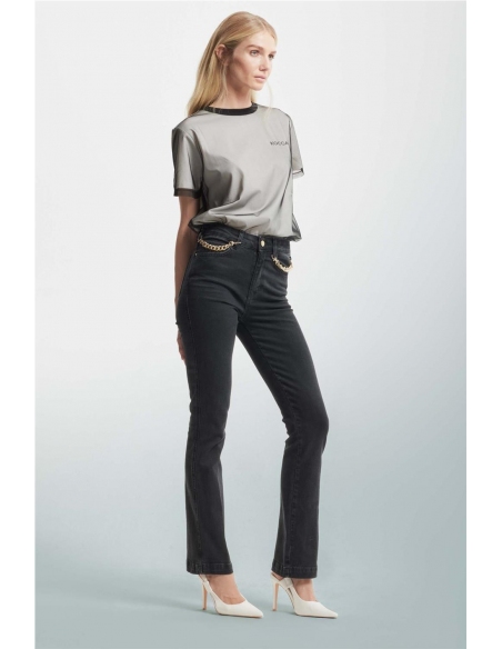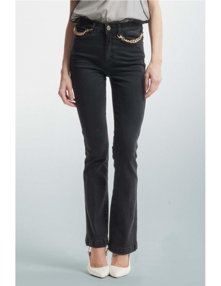 Jeans de mujer con detalle de cadenas metálicas con mosquetón en los bolsillos. De algodón ligeramente elástico y corte ceñido. Composición 99% cotone 1% elastan