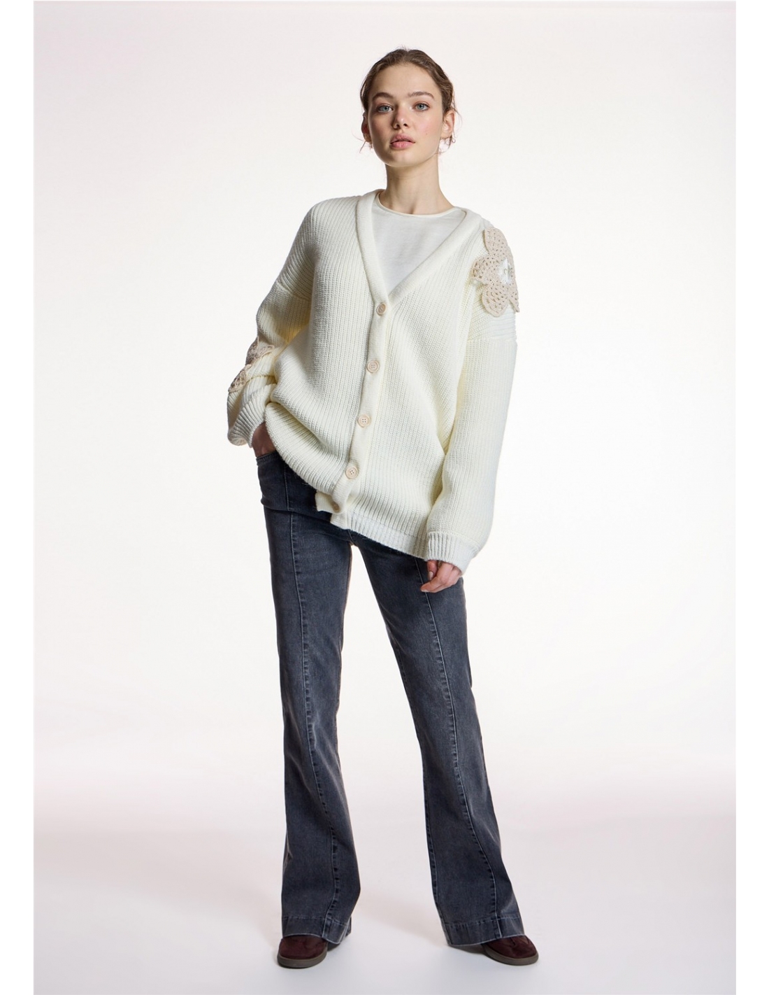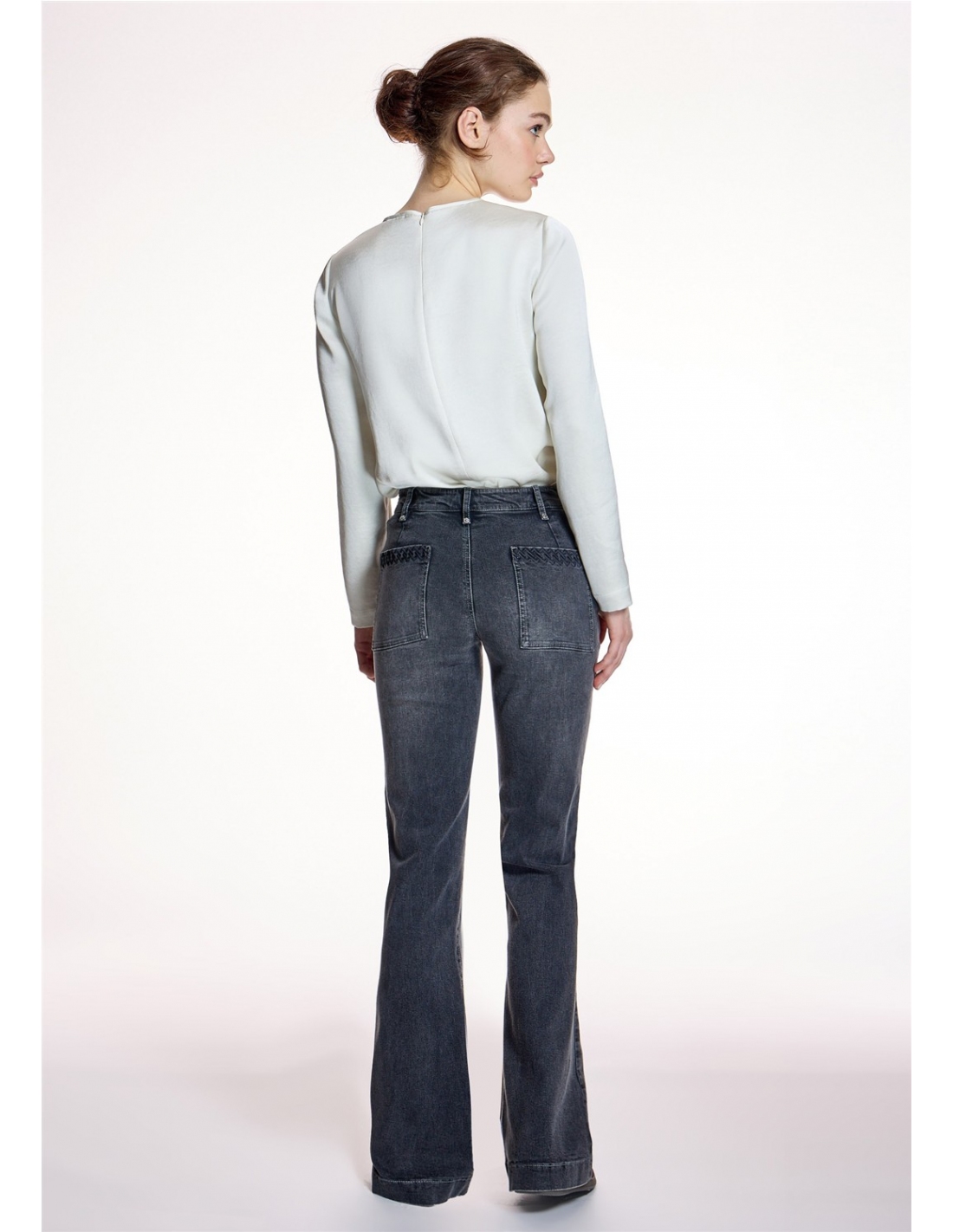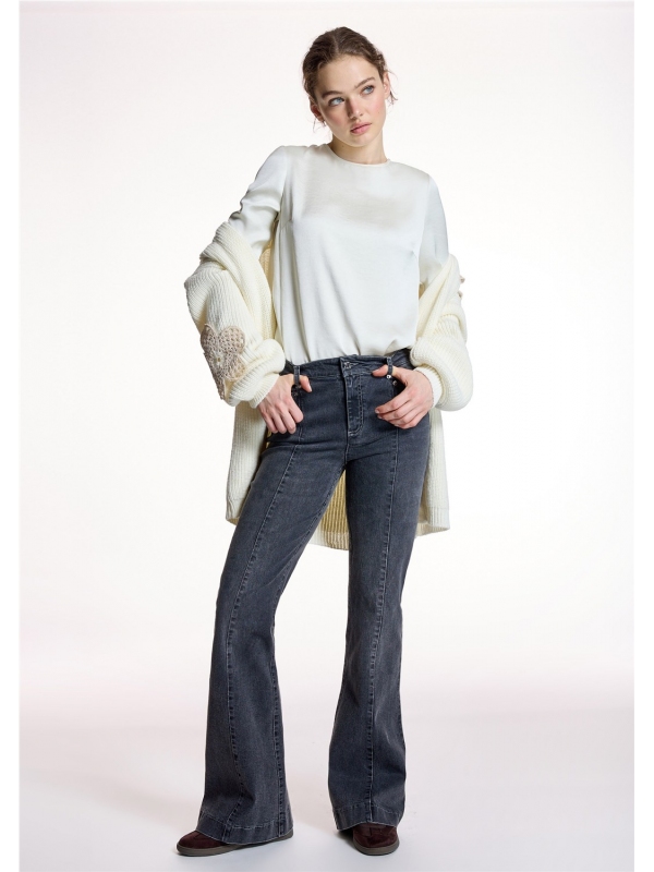 Jeans entallado bajo flared ALBA CONDE. Este modelo de tiro medio presenta trabillas en cintura, bolsillos laterales delanteros y de plastrón posteriores. Cierre central con cremallera metálica oculta por tapeta y botón.