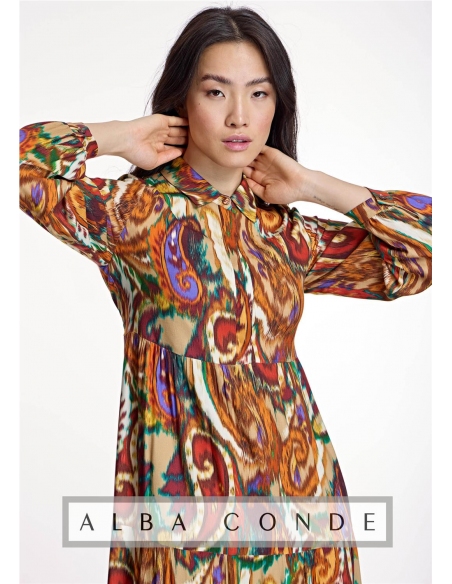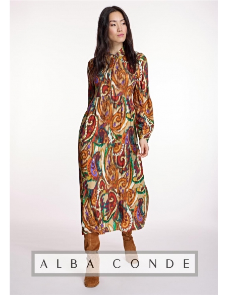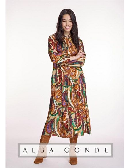 Este vestido largo presenta un elegante patrón de paisley que evoca un aire bohemio y sofisticado. Confeccionado en una suave tela que fluye con el movimiento, su diseño destaca por un escote sutil y mangas delicadas que añaden un toque romántico. Ideal para ocasiones especiales o un día casual, su corte favorecedor se adapta a diferentes tipos de cuerpo, mientras que los colores vibrantes del estampado aportan frescura y estilo.