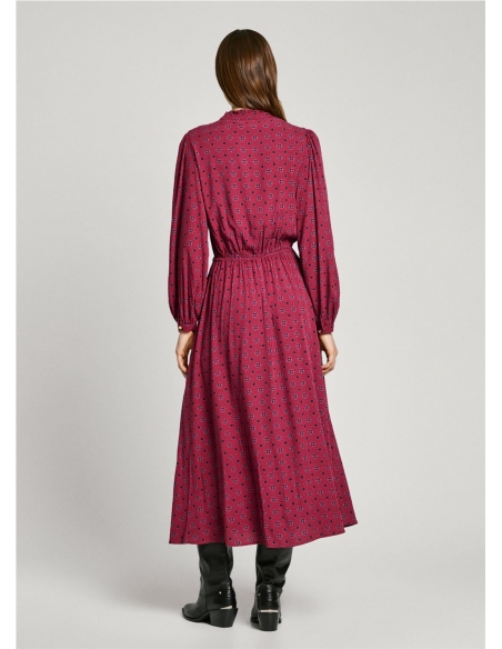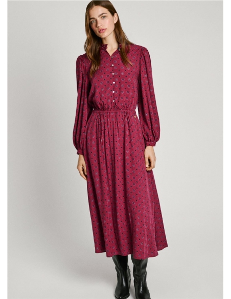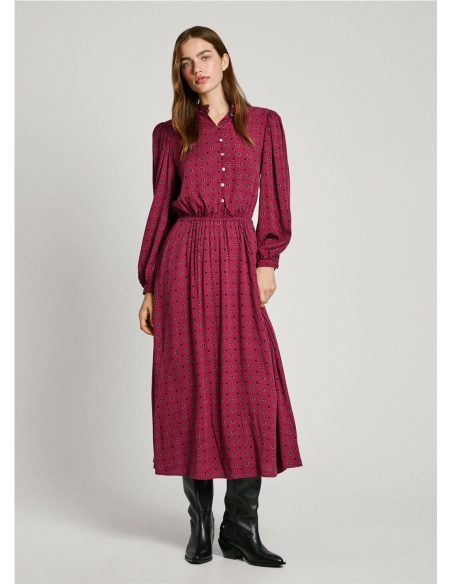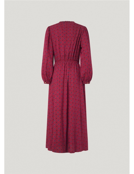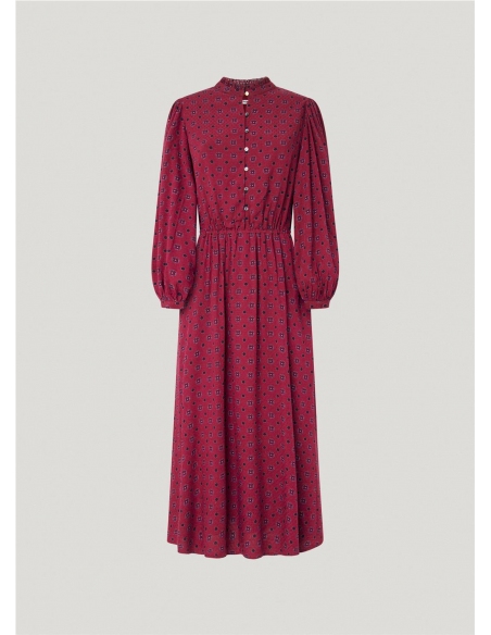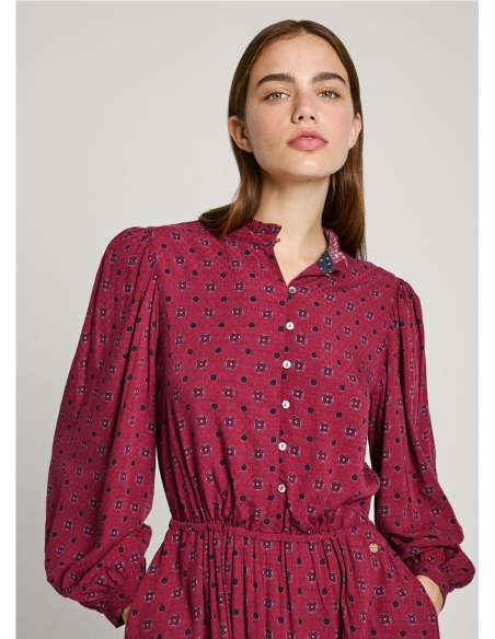 - Vestido largo en tejido fluido - Cuello redondo con mini volantes - Manga larga abullonada - Cierre frontal abotonado hasta la cintura - Estampado de flores y lunares all over - Cintura elástica - Falda fluida con volantes en bajo - Puños abotonados