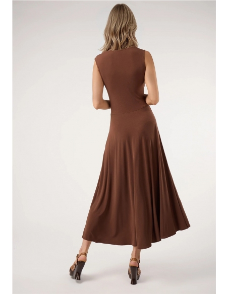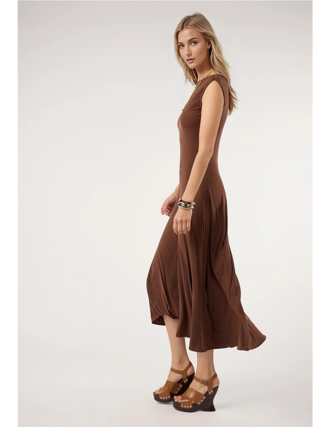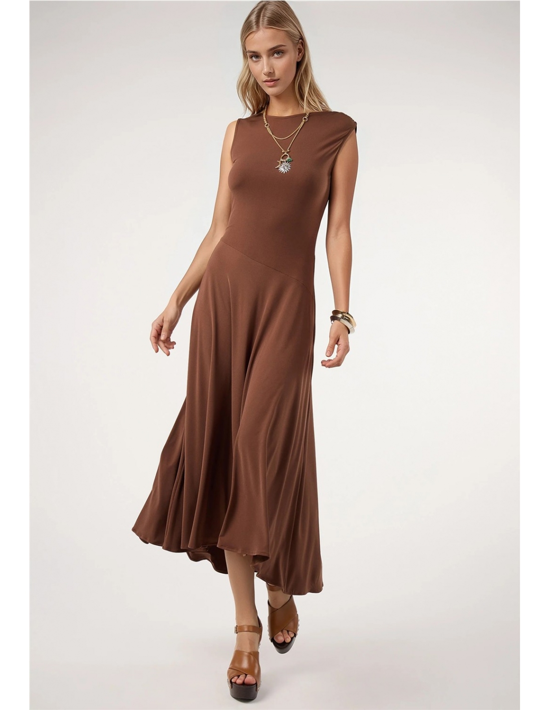 Vestido confeccionado en tejido fluido con caída suave y movimiento natural. Presenta cuello redondo y hombro ligeramente marcado, además de un corte evasé que aporta amplitud y un diseño muy favorecedor. Su silueta limpia y el acabado elástico del tejido lo convierten en una prenda cómoda, versátil y perfecta tanto para looks casuales como para ocasiones más especiales.