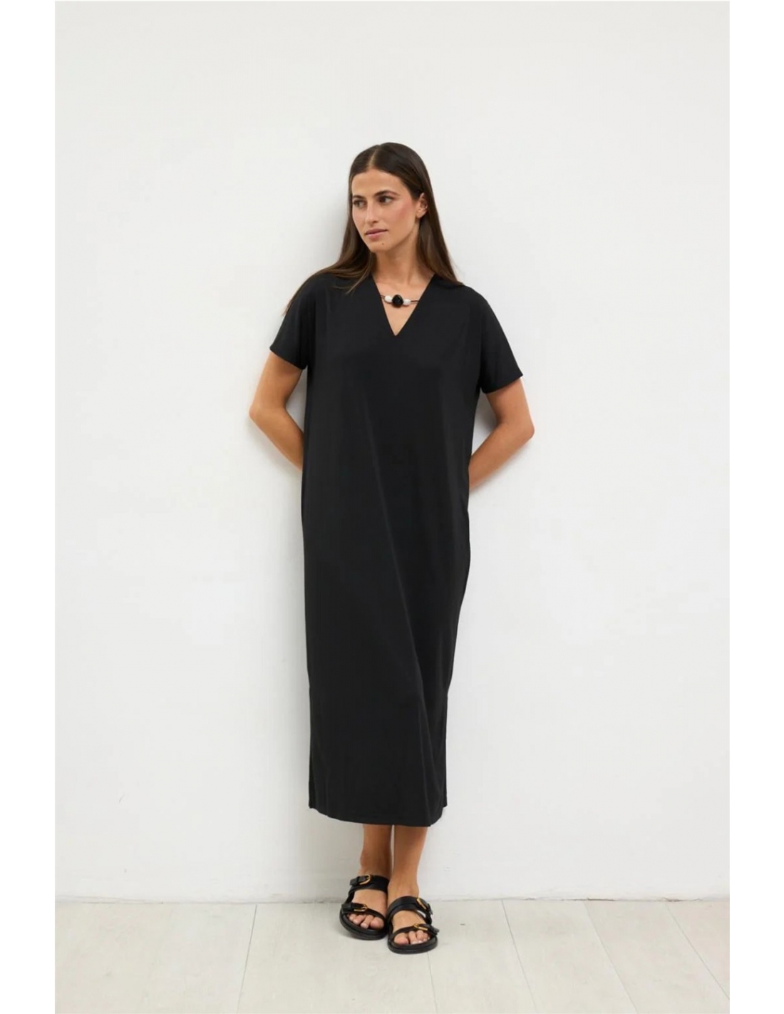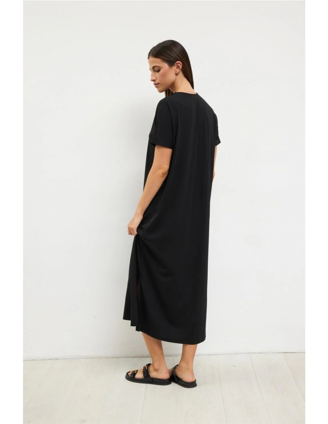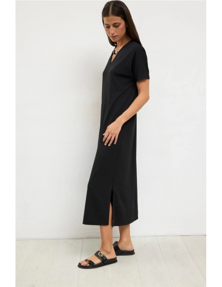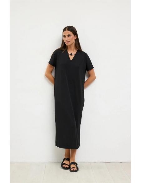 Vestido midi de manga corta. Cuello de pico con detalle de aplique decorativo en el escote. Corte recto con aberturas laterales. Bajo recto. Diseñado y fabricado en España.