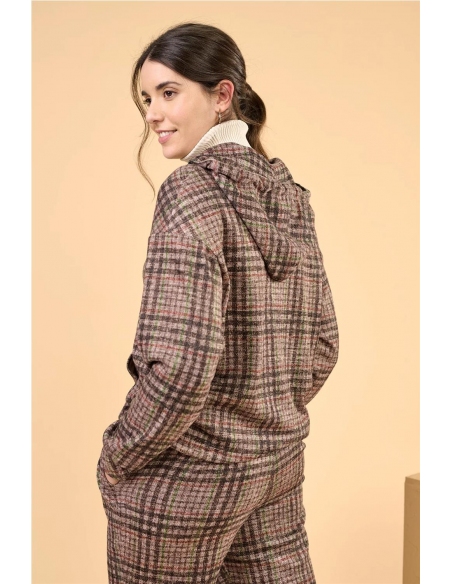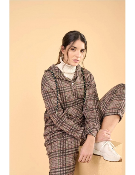 Tejido suave. Jersey con cierre con botones dorados y bolsillo amplio delantero. Capucha y cordones
