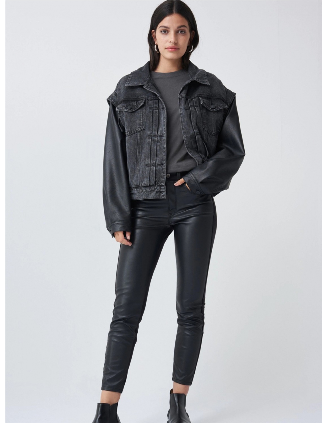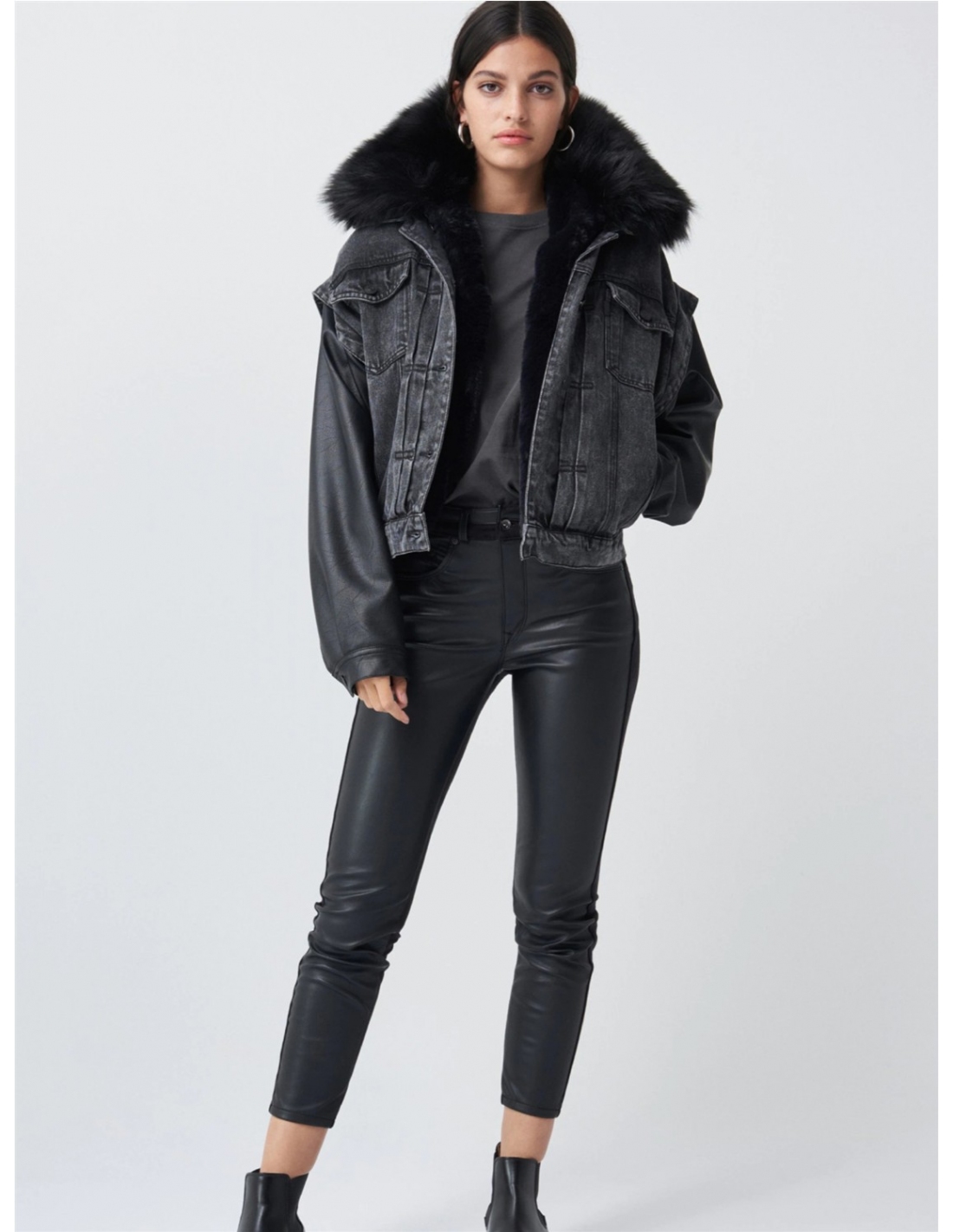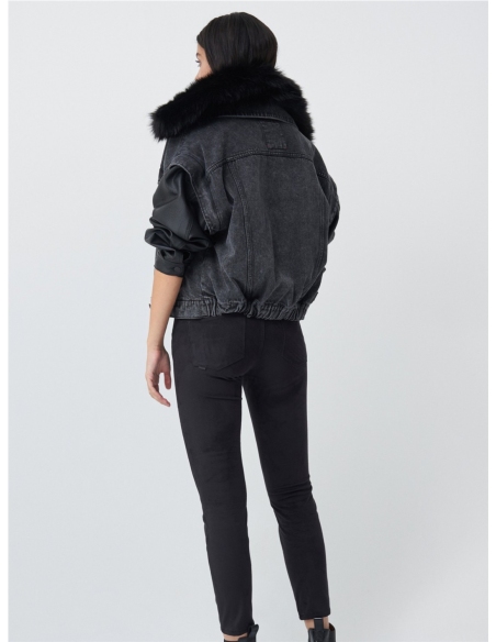 Chaqueta negra de mujer con pelo de Salsa Jeans. Las mangas de piel sintética y el forro de piel con cuello se pueden quitar. Después de desabotonarlo, quedan un chaleco vaquero y un chaleco de piel.