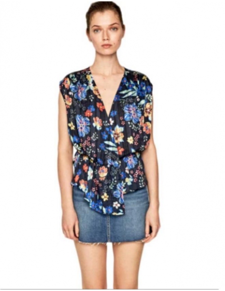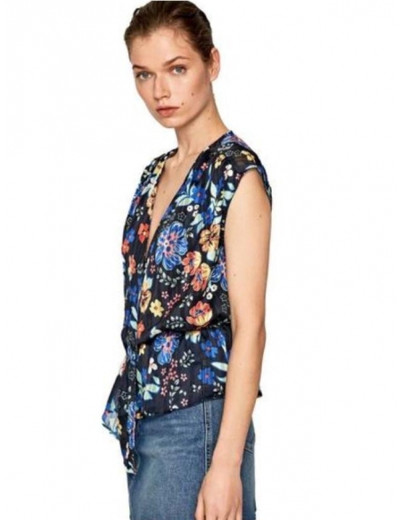 Blusa estampada sin mangas con cierre delantero cruzado.